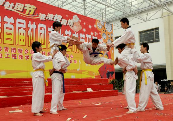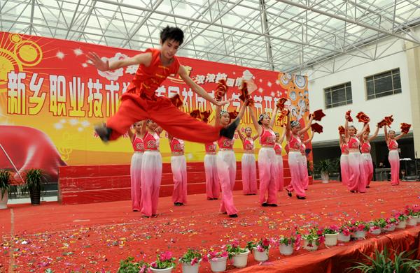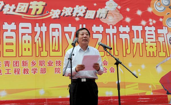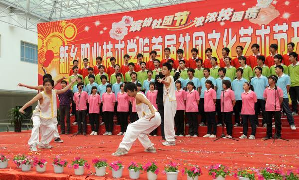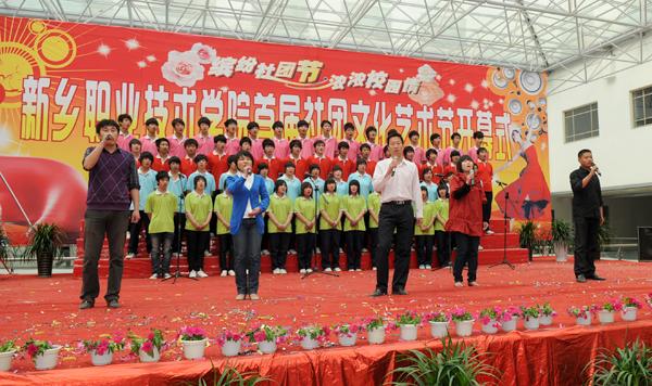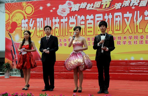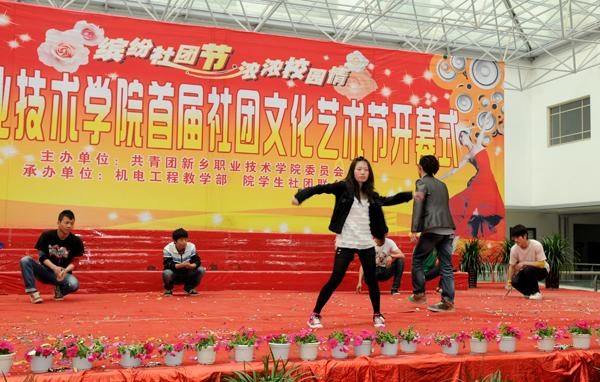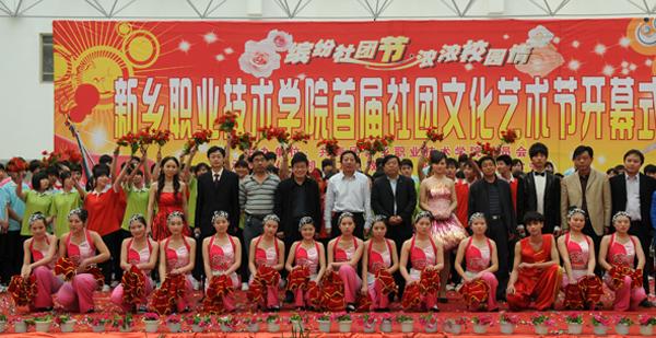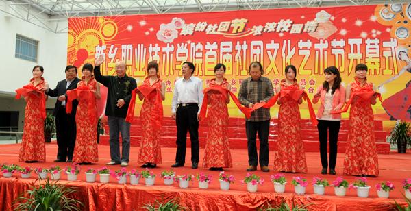 4月19日下午,新乡职业技术学院首届社团文化艺术节在综合楼大厅隆重开幕。河南省教学厅专家检查组组长陈永海、副组长彭西春,共青团新乡市委副书记王旸,学院党委书记朱性福,人事与劳动保障局副局长、学院党委副书记刘文艺,学院副院长赵金周,宣传部长尚建军,教务处长邵明仓及质量办、学生处、各教学部领导出席开幕式,近千名学子现场观看了开幕式表演。