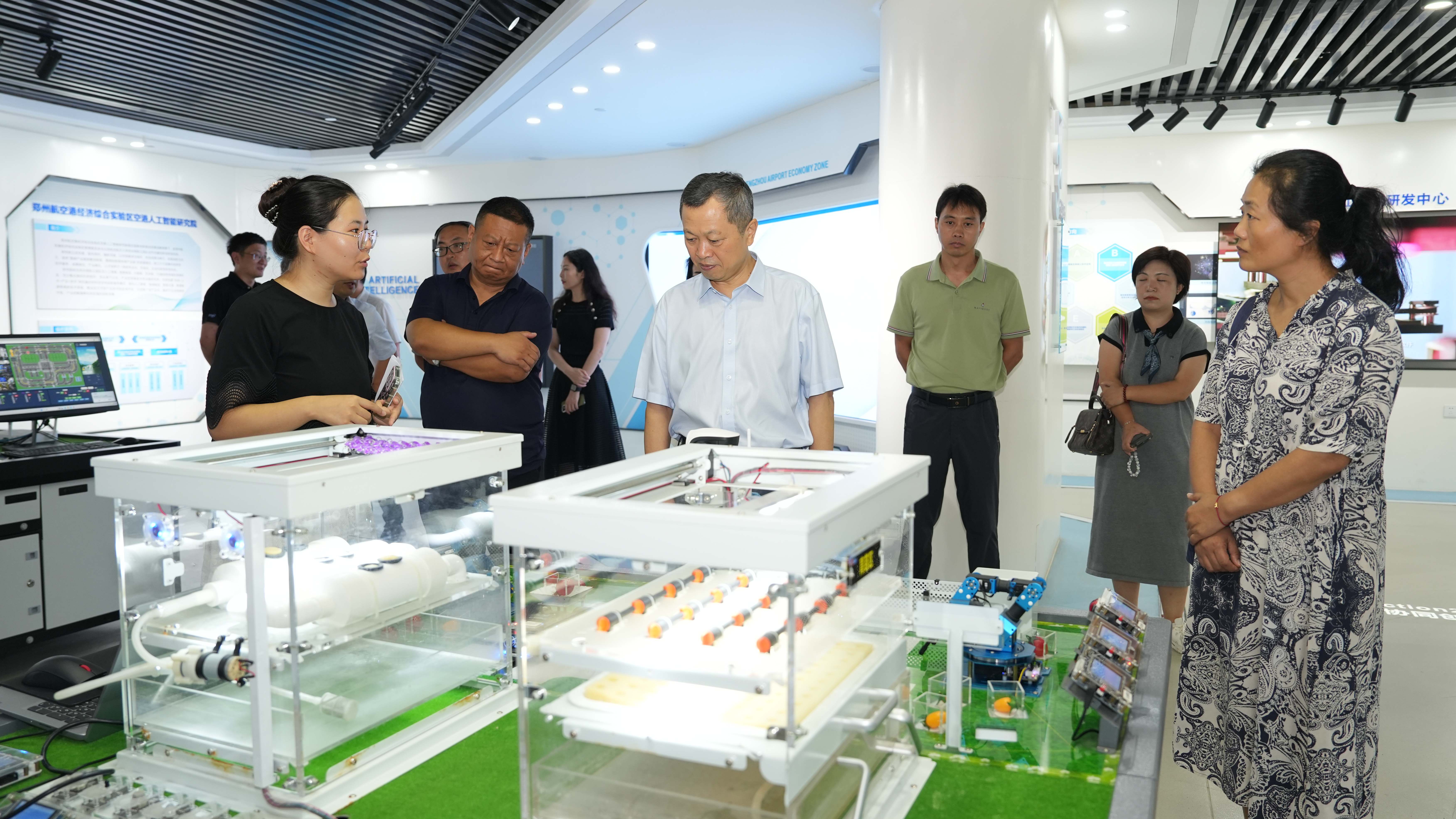 在郑州空港人工智能研究院常务副院长姜鑫的陪同下,张林一行现场考察了郑州空港人工智能研究院科技创意展厅、实验室、工程中心、孵化企业和科普基地。