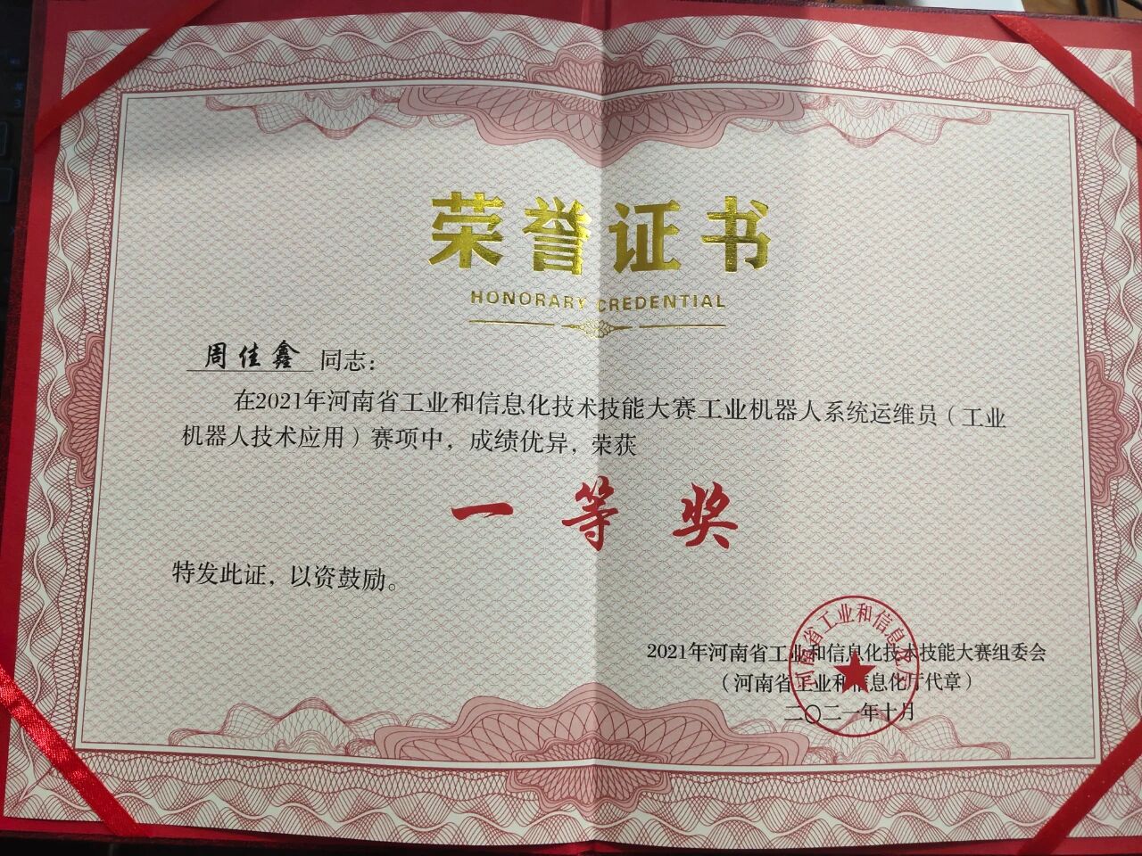 功夫不负有心人。2021年,他和队友一举拿下河南省机器视觉大赛二等奖。领奖台上,他紧握奖状,手心的汗水浸湿了纸张,但心里却燃起了从未有过的自信。