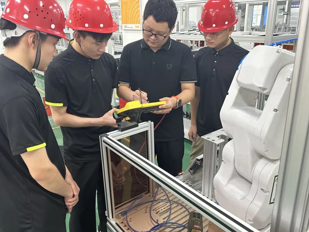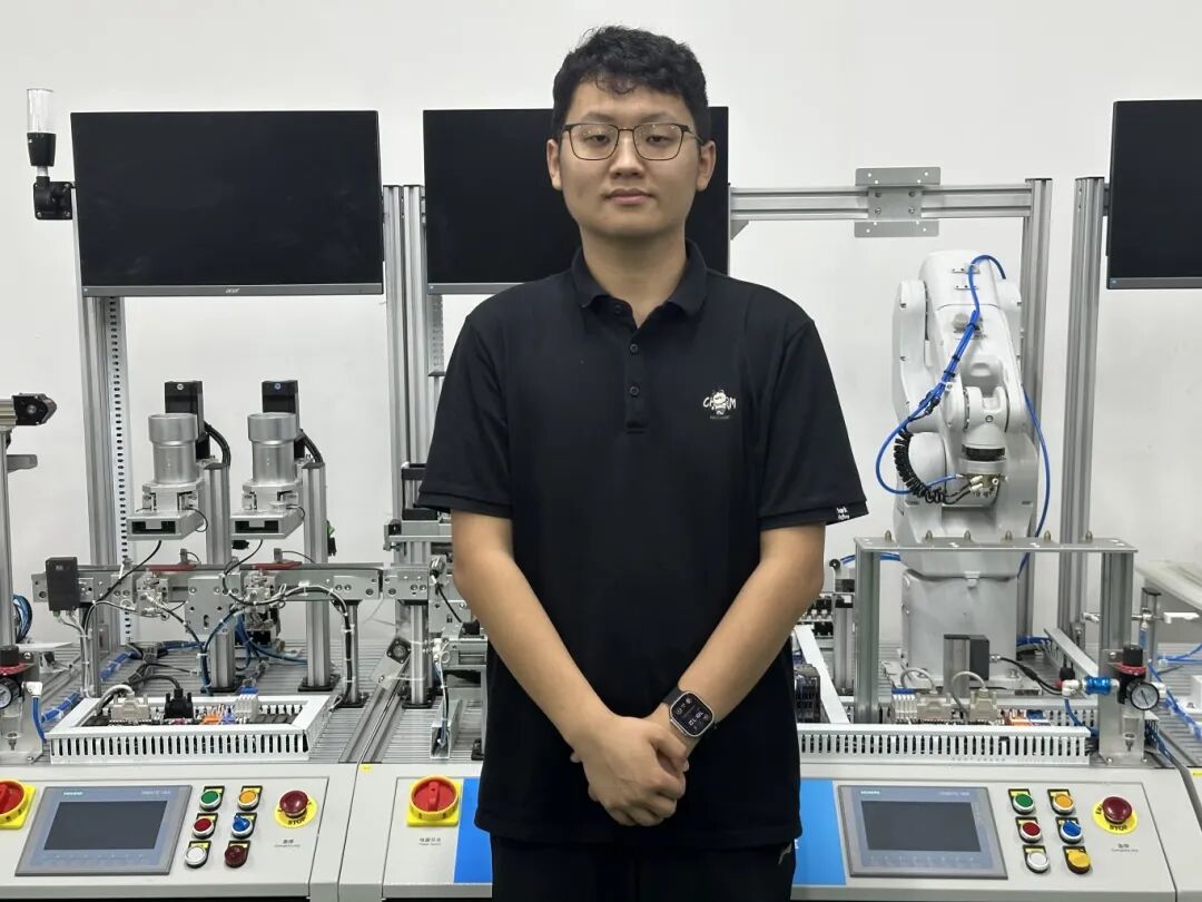 那段时间,他的生活只剩下训练。每天早上7点半,他准时出现在实训室,反复练习线路、气路连接、机械臂的轨迹规划、视觉系统的精准标定等软件编程;晚上9点半,别人早已回宿舍休息,他还在整理当天的数据,啃着厚厚的理论教材。尹老师常常陪他到深夜,有时递上一杯热牛奶,有时只是默默坐在一旁,等他遇到难题时再点拨几句。