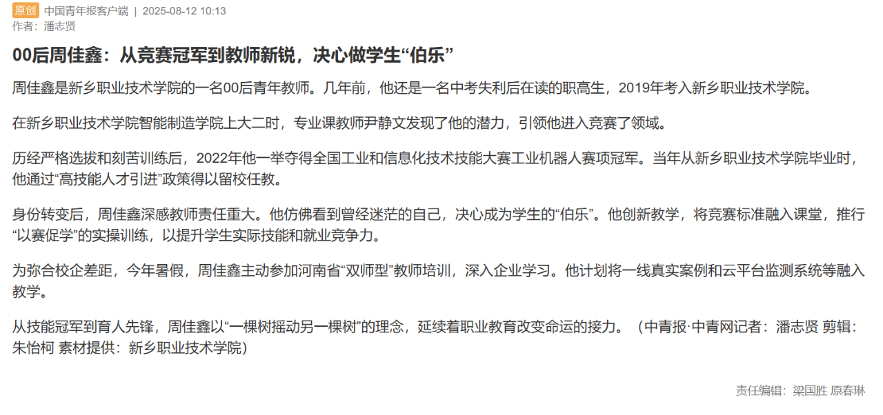 周佳鑫的故事并未止步于领奖台。他的经历被《中国青年报》连续报道,成为许多同龄人心中“工匠精神”的真实注脚。如今,周佳鑫依然活跃在实训车间和赛场。国家“技能强国”的战略让职业教育焕发新生,他的故事也被越来越多的学生视为榜样。