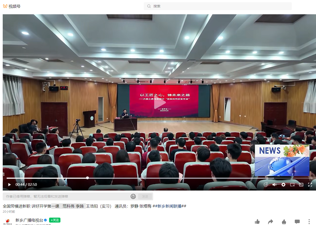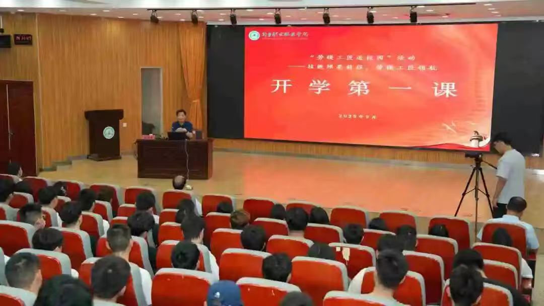 为深入学习贯彻习近平新时代中国特色社会主义思想,推动劳模精神、劳动精神、工匠精神融入学校教育全过程,学校于新学期伊始举行“劳模工匠进校园”系列活动。我校杰出校友、新乡航空工业(集团)有限公司首席技能专家、全国劳动模范孟祥忠于9月9日为我校学子带来了一场内容深刻且贴近生活的“开学第一课”,各二级学院学生代表200余人参加本次课程。