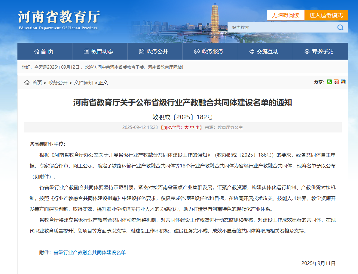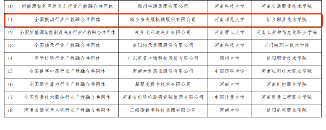 9月11日,河南省教育厅公布省级行业产教融合共同体建设项目名单,我校作为高水平高职院校牵头组建的全国振动行业产教融合共同体,成功跻身 18 家首批省级共同体建设名单之列。