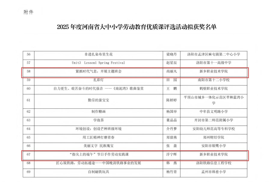 近日,2025年度河南省大中小学劳动教育优质课评选结果正式揭晓,我校教师凭借扎实的教学功底与创新的课程设计,在此次省级赛事中创下佳绩。马克思主义学院尚丽凡老师主讲的《紧抓时代气息 开展主题班会》、浮宁晖老师主讲的《“指尖上的端午”节日手作劳动实践课》双双荣获省级一等奖。