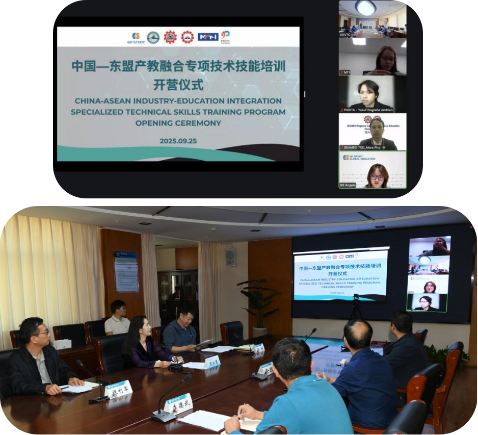 为积极推进“职教出海”发展战略,助理中资企业海外发展,深化中国与东盟在职业教育领域的合作交流,充分发挥我校在智能制造领域的专业优势,2025年9月25日下午,由继续教育与培训学院组织,科研外事处、智能制造学院、数控技术学院等共同参与,与东盟政府组织、中资海外企业多方协同开展的“中国—东盟产教融合专项技术技能培训项目”开营仪式,通过云端平台顺利举行。我校副校长原淑慧、东南亚教育部长组织技术教育发展区域中心(SEAMEO TED) 技术教育与培训处处长Mara Pho、中策橡胶集团印尼子公司MTI有限公司(PT.MTI )人力资源经理Windi、东南亚青年可持续发展基金会(PASITA)理事Yusuf Nugraha Andrian等出席并致辞。