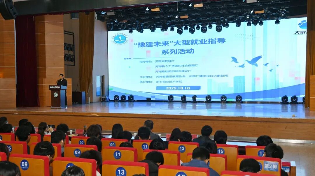 10月10日,由河南省建设教育协会、河南广播电视台大象新闻网主办,新乡职业技术学院承办的“豫建未来”大型就业指导系列活动在新乡职业技术学院报告厅隆重举行。活动聚焦建筑业转型期的人才培养与职业发展,邀请到河南城建学院教授王小召、安阳市建工职业培训学校校长肖丹,以及河南省建设教育协会“双碳”和ESG发展中心主任刘磊交流分享,建筑学院全体师生参与,共探行业变革中的成长路径。