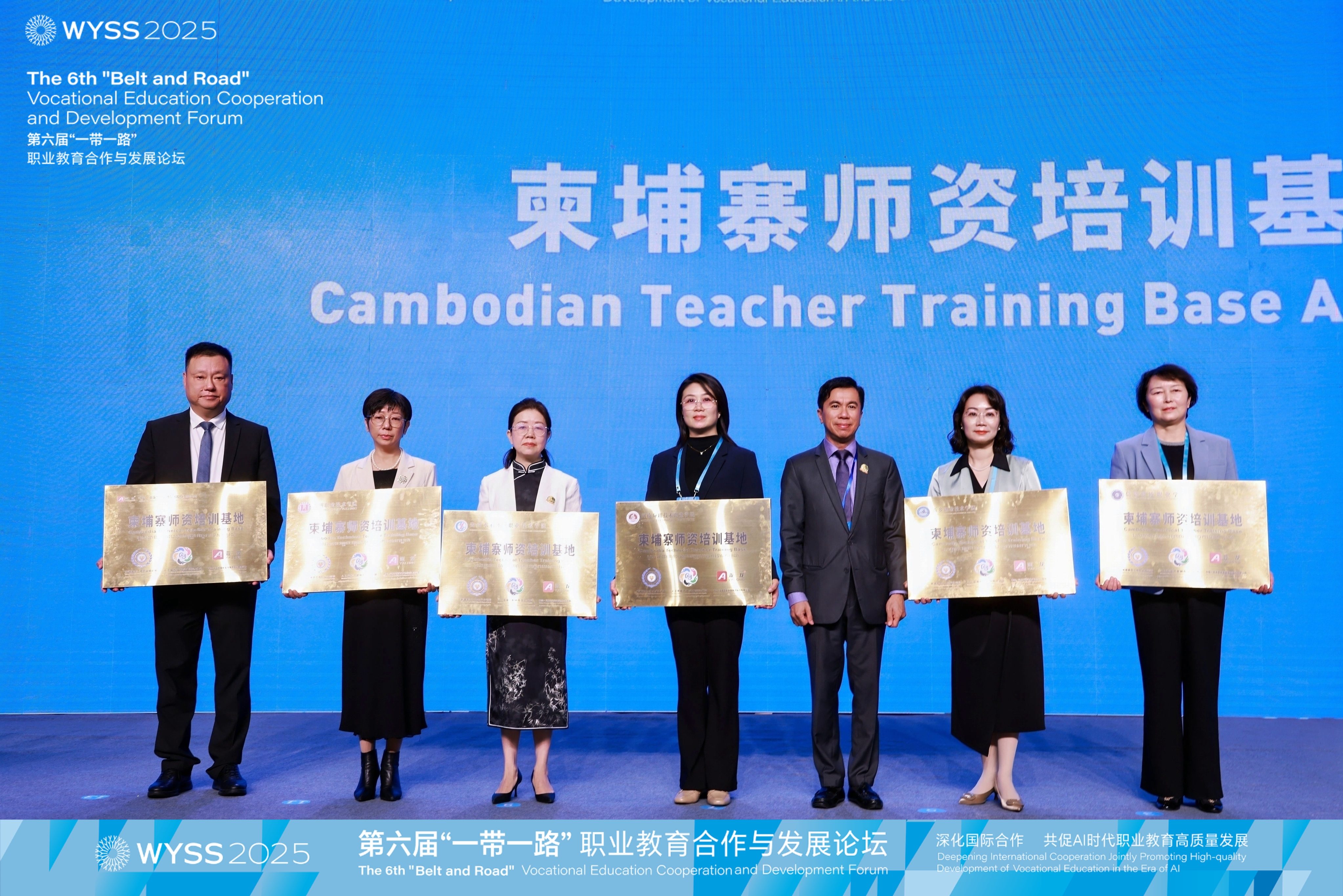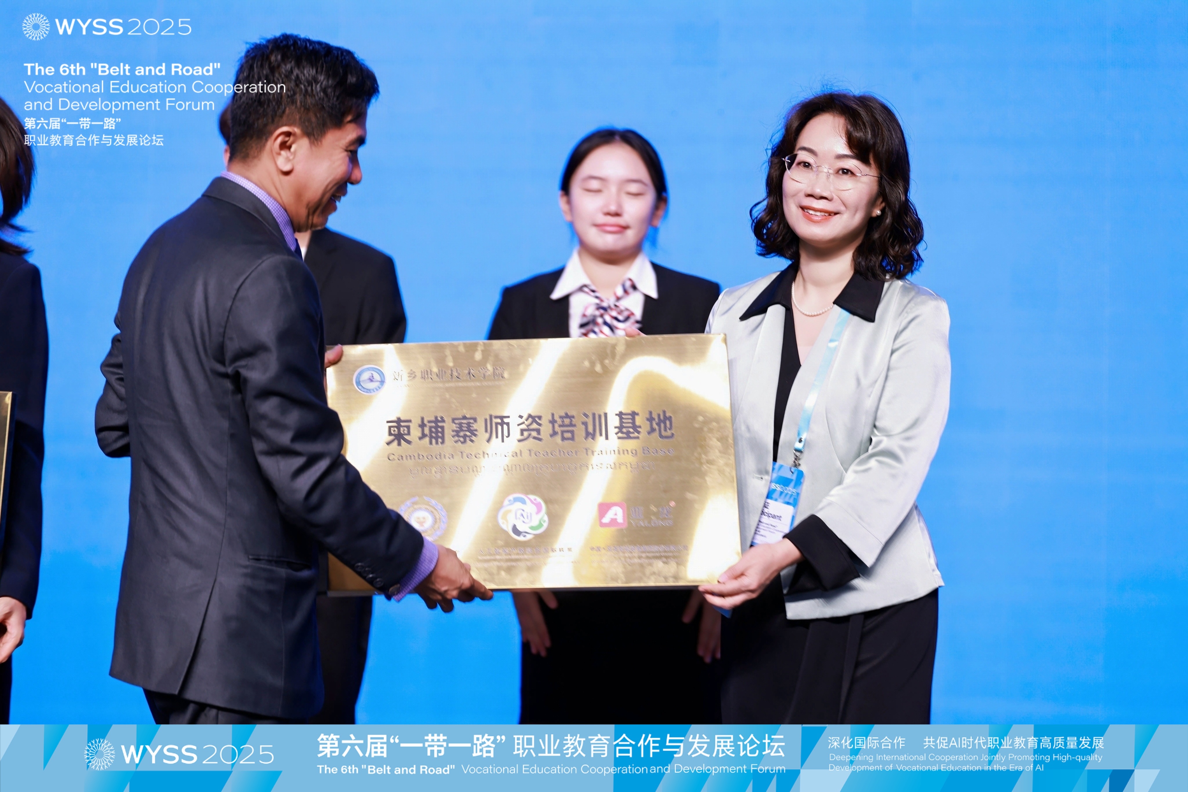 在论坛开幕式上,柬埔寨劳工与职业培训部国务秘书(副部长)谢顾所发表致辞。他高度评价中柬在职业教育领域的务实合作,并现场发出深化合作邀约,期待更多中国优质教育资源走进柬埔寨,助力当地技术技能人才培养。在此重要时刻,我校被柬埔寨劳工与职业培训部联合“人工智能产教融合国际联盟”与亚龙智能装备集团股份有限公司正式授予“柬埔寨师资培训基地”称号,标志着我校国际化办学迈入新阶段。此次授牌不仅是对我校前期参与柬埔寨国际师资培训成果的肯定,更是对学校服务国家“一带一路”倡议、践行职业教育对外开放使命的高度认可。