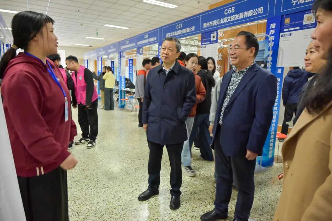 校领导一行来到招聘现场,与用人单位深入交流,了解各单位用人需求,听取用人单位对我校人才培养、专业建设、就业指导服务等方面的意见与建议。