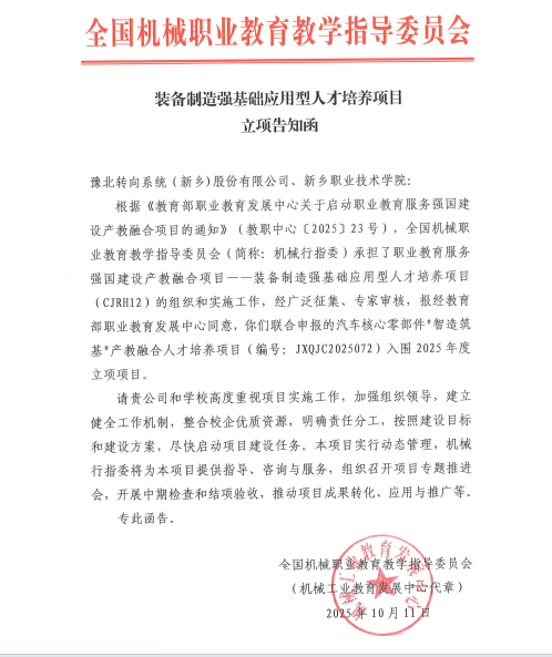 为贯彻全国教育大会精神,落实《教育强国建设规划纲要(2024-2035年)》和《加快建设教育强国三年行动计划(2025-2027年)》部署要求,推动深化产教融合,提高职业教育支撑服务能力,更好发挥职业教育在服务强国建设中的作用,教育部职业教育发展中心启动实施了“职业教育服务强国建设产教融合项目”。全国机械职业教育教学指导委员承担了装备制造强基础应用型人才培养项目(CJRH12)的组织和实施工作。新乡职业技术学院以智能制造学院为培养单位,联合豫北转向系统(新乡)股份有限公司申报的汽车核心零部件“智造筑基”产教融合人才培养项目,经专家审核,报请教育部职业教育发展中心同意,获批立项。