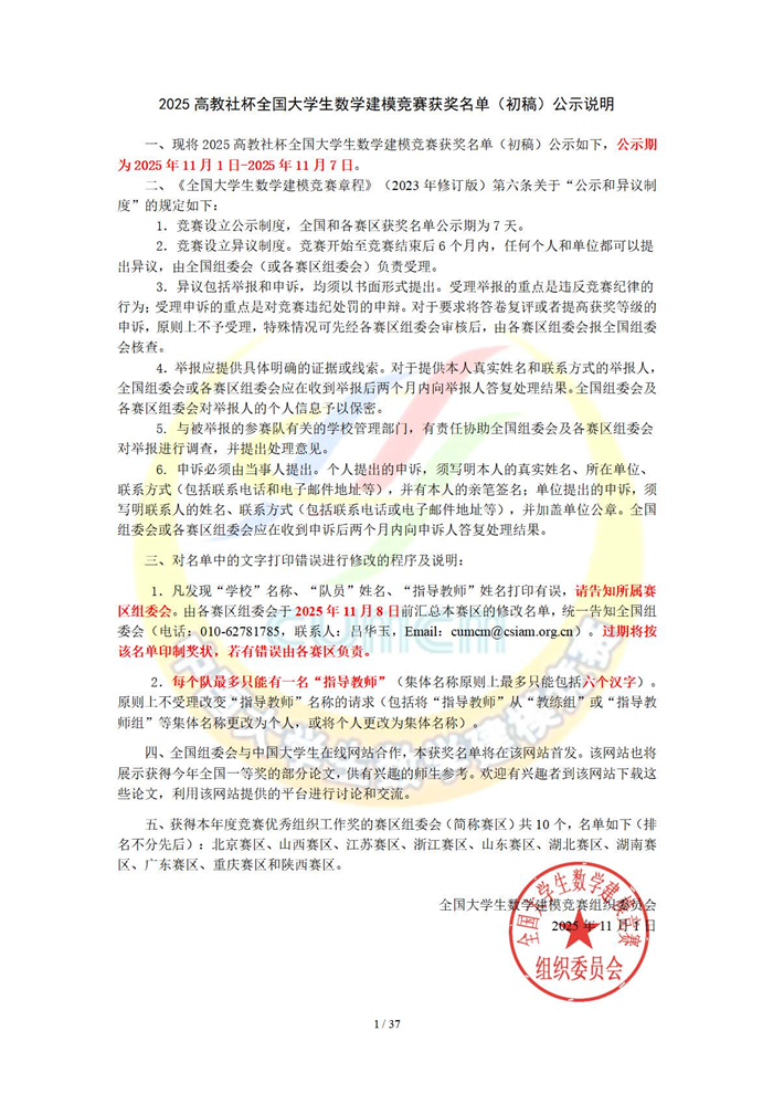 全国大学生数学建模竞赛作为全国高校规模最大、影响力最广的基础性学科竞赛之一,赛事题目涵盖经济、环境、资源、安全等多个领域,重点考察参赛者运用数学方法解决实际复杂问题的综合能力与团队协作水平,竞争异常激烈 。此次获奖团队在备赛过程中,于许霞老师的悉心指导下,历经问题拆解、模型构建、数据验证、论文撰写等多个关键环节,每一步均精益求精。团队成员充分发挥专业所长,将课堂所学理论知识与实际问题深度融合,通过反复论证与优化,最终形成了逻辑严谨、论证充分的参赛作品,得到评审专家的认可。