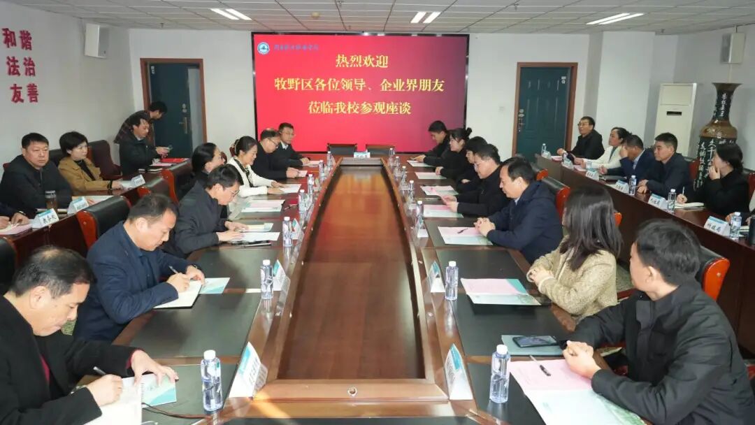 牧野区人社局、科技局、工信局、商务局相关负责人,天力锂能、新太行电源、丰收新能源、领先轻工机械等多家区域重点企业代表,学校相关职能部门、二级学院负责人参加会议。