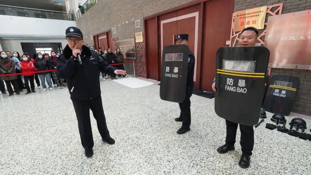 为切实筑牢校园安全防线,提升师生及管理人员应对突发恐怖事件的处置能力与防范意识,2025年12月4日上午9时,我校安全保卫处联合辖区公安机关,在综合楼校史馆前一楼大厅成功开展以“全民反恐共创平安”为主题反恐怖宣传教育演练活动。