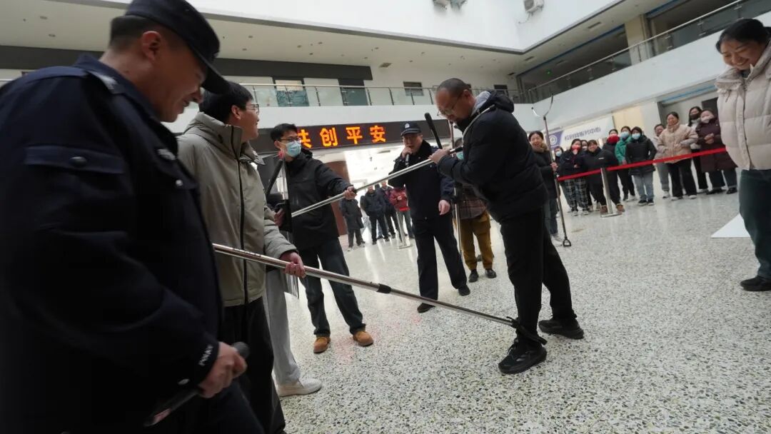 纬七路派出所教导员,一级警长申醉,结合校园场景特点,首先详解突发恐怖事件的处置流程,明确“先避险、再联动、后处置”的实操原则。其次演示制服“暴徒”的关键动作要领,重点讲解防暴叉、盾牌等常用器械的使用技巧,以及与队友的协同配合方法。最后分享控制嫌疑人的科学思路,指导参训人员避开危险误区,掌握“以巧取胜、安全可控”的处置策略。