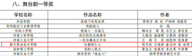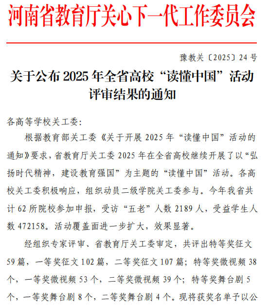 12月9日,河南省教育厅关工委发布了《关于公布2025年全省高校“读懂中国”活动评审结果的通知》,我校关工委提交的4项参赛作品全部获奖,其中省级一等奖3项、二等奖1项。此项荣誉实现了我校关工委工作质的飞跃,获奖成绩在全省高职院校中名列前茅。