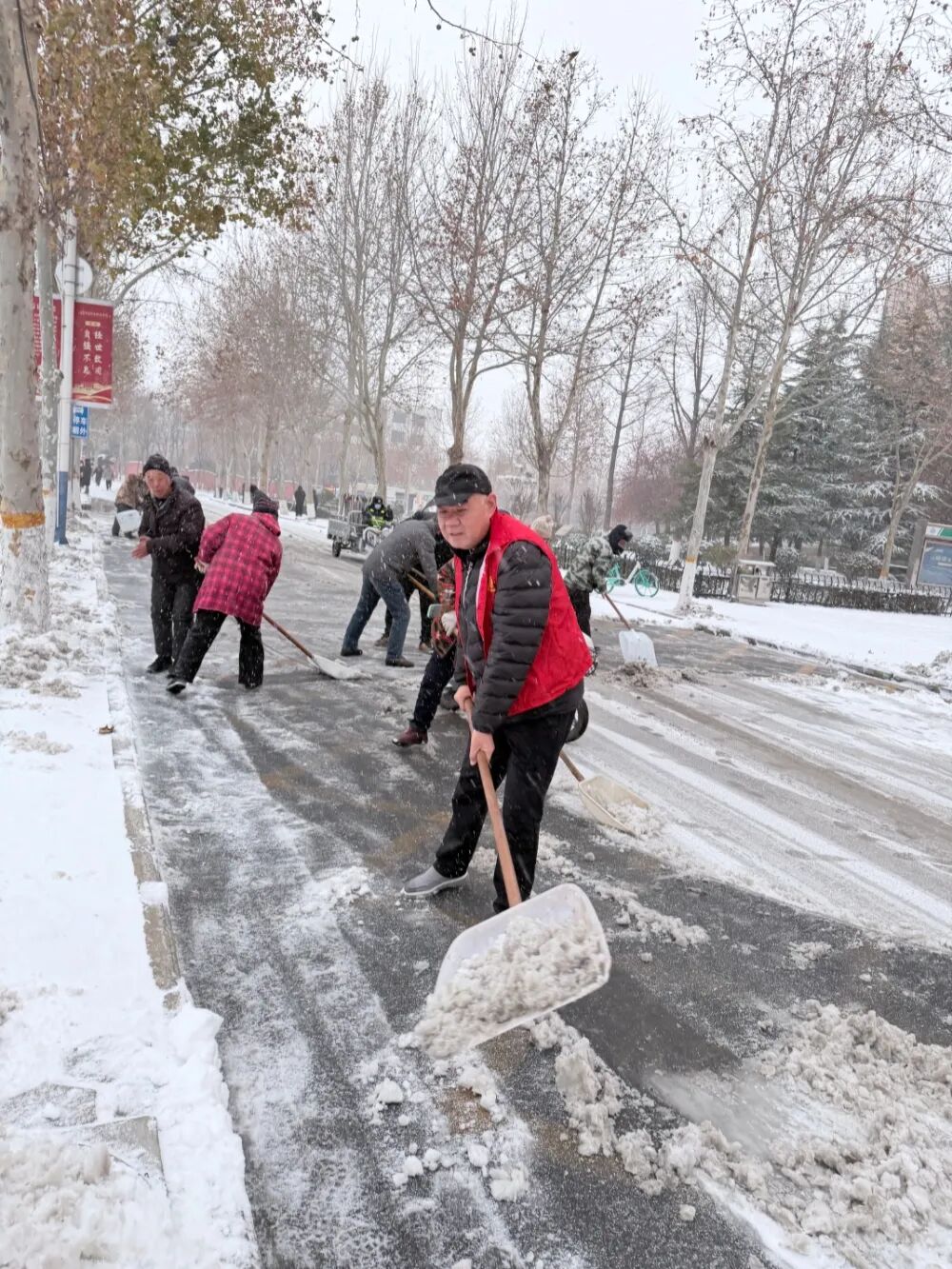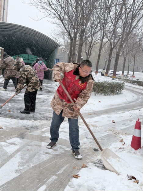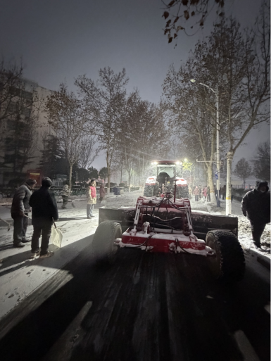 雪情即是命令,安全就是责任。职教后勤服务公司坚决响应学校号召,闻雪而动、全员上岗,第一时间启动应急预案。领导班子带头值守、靠前协调,全体职工与绿化、保洁中心同仁并肩作战,主动延迟下班,全力投入扫雪除冰攻坚战。大家挥锹扬铲、热忱涌动,重点清理校园主干道、西大门等关键区域,用心为师生扫出一条"平安路""温暖道"。