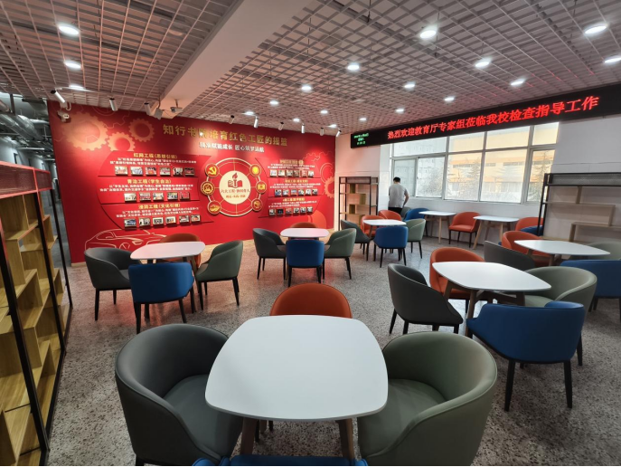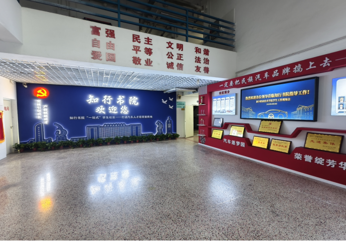 将社区物理空间打造成沉浸式育人课堂:一楼文化长廊左侧铺展中国汽车发展史、右侧梳理党的光辉历程,让学生在通行中感受工匠精神与红色基因;3楼红色书屋常态化开展红色读书会,4楼红色实践创新区、5楼运动区满足多元发展需求。各楼层楼梯间的“阶梯课堂”独具特色,党的精神谱系、党员毕业生榜样、行业标杆人物、专升本典型案例依次呈现,让学生在拾级而上中浸润“工匠精神+党员担当”。