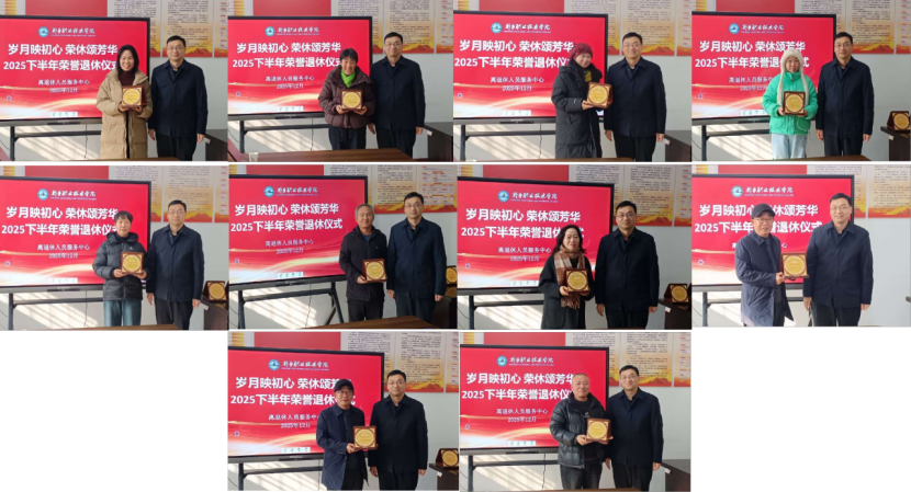 为感念退休教师深耕职教的无悔付出,传承“尊重知识、尊重人才”的优良传统,12月18日,新乡职业技术学院西校区党员活动室暖意融融,2025年下半年“岁月映初心·荣休颂芳华”荣誉退休仪式在这里圆满举行。校党委副书记闫金友同志来到活动现场,与17名退休人员齐聚一堂,共话岁月情长。