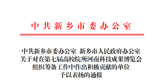 近日,中共新乡市委办公室、新乡市人民政府办公室印发《关于对在第七届高校院所河南科技成果博览会组织筹备工作中作出积极贡献的单位予以表扬的通报》,对我校在高校院所河南科技成果博览会组织筹备和举办过程中展现出的卓越组织力和科研成果精彩展示给予高度肯定,并作为优秀组织单位予以通报表扬。