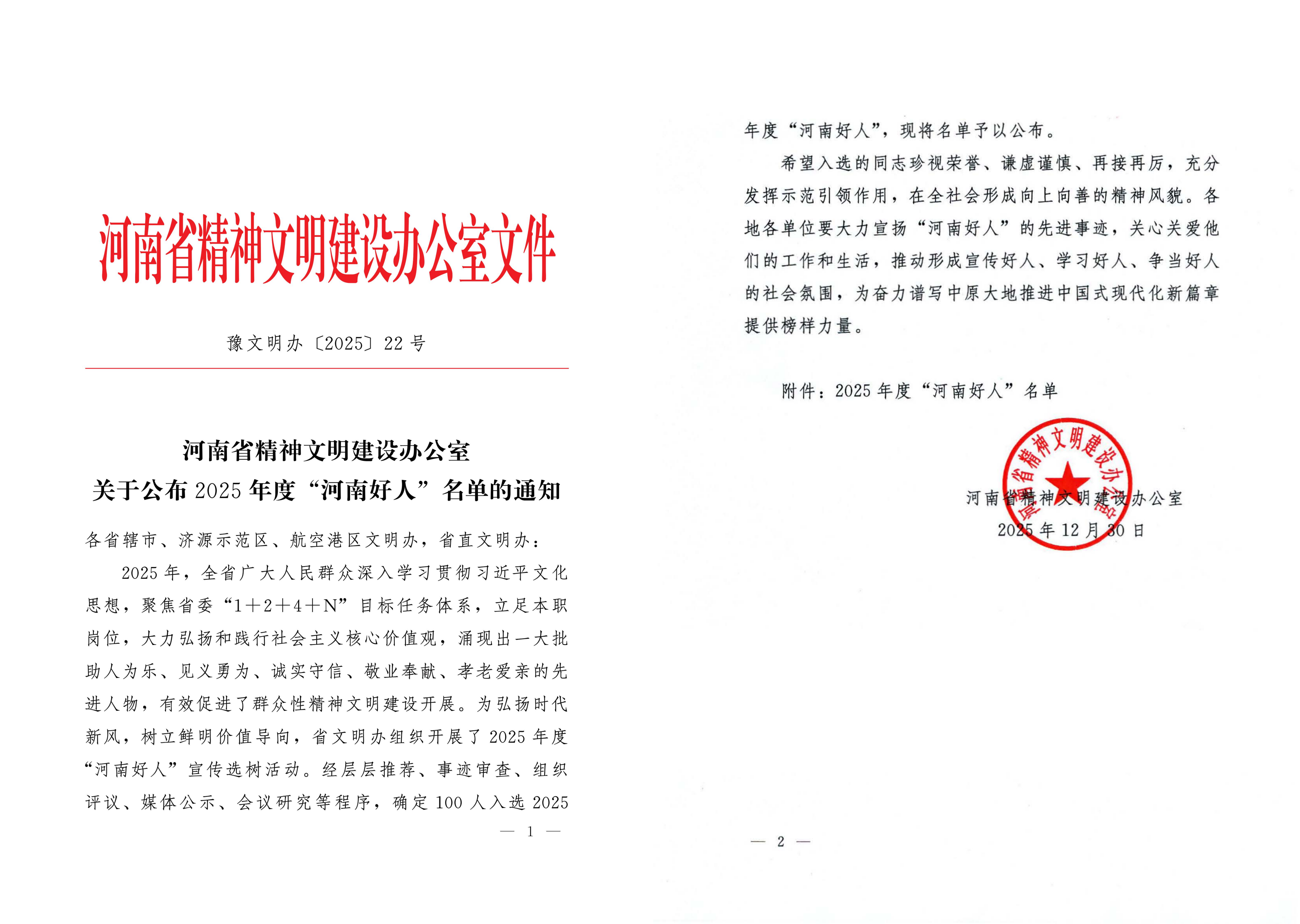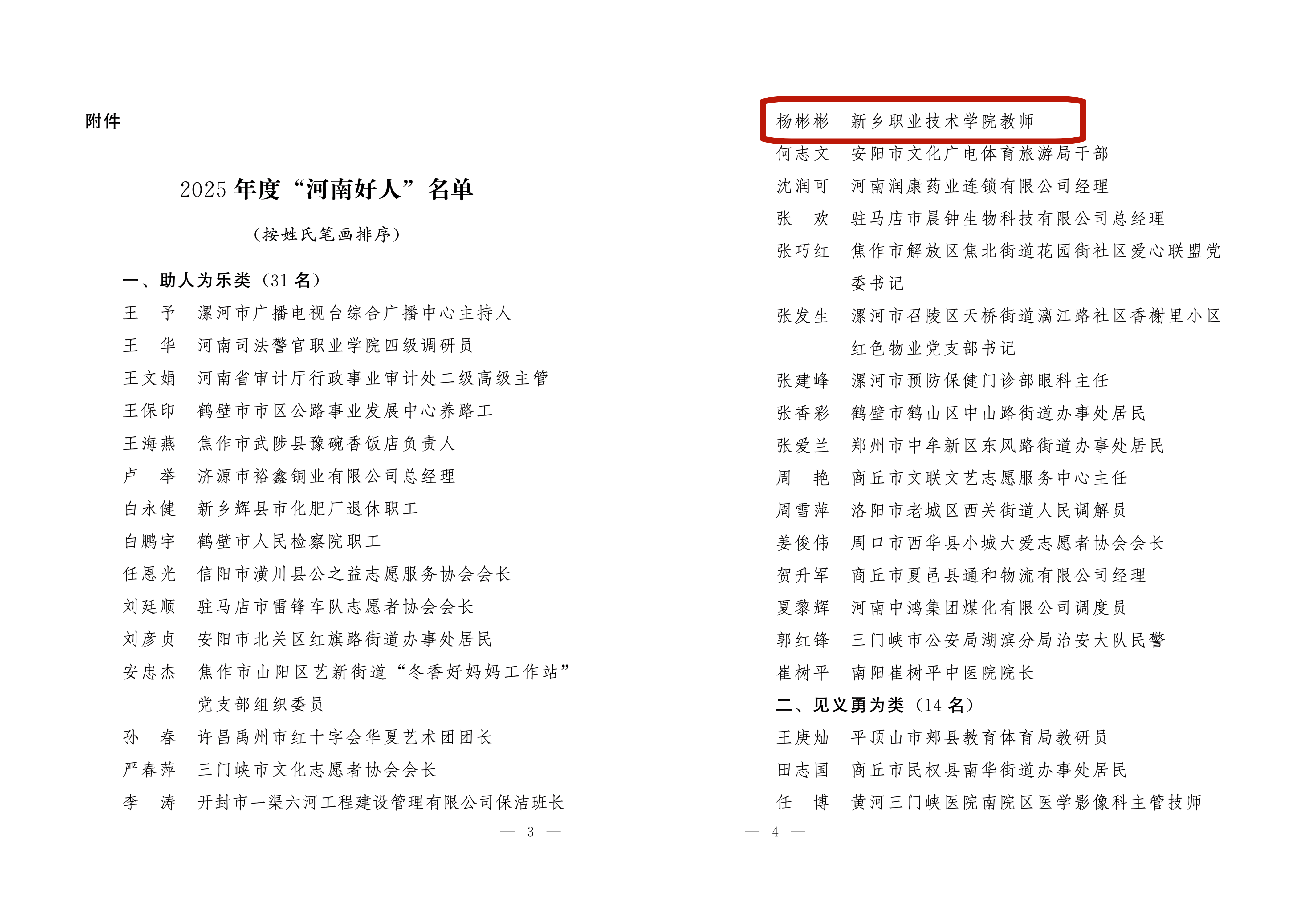 近日,河南省精神文明建设办公室发布2025年度“河南好人”名单,新乡职业技术学院数控技术学院教师杨彬彬光荣入选“助人为乐类”好人。此次获评,是对她长期以仁爱之心关怀学生、以切实行动助人成才的崇高精神与扎实实践的充分肯定。