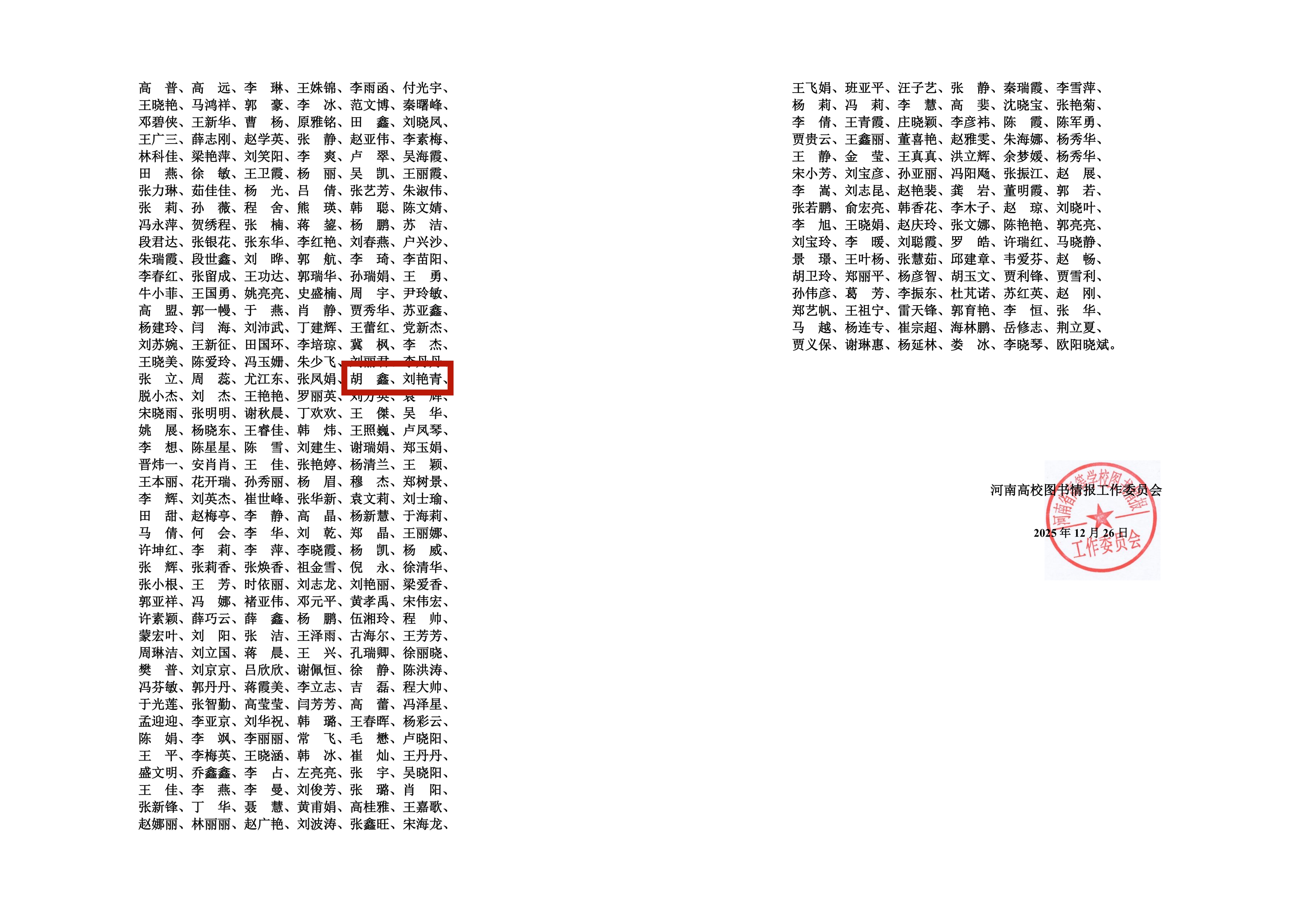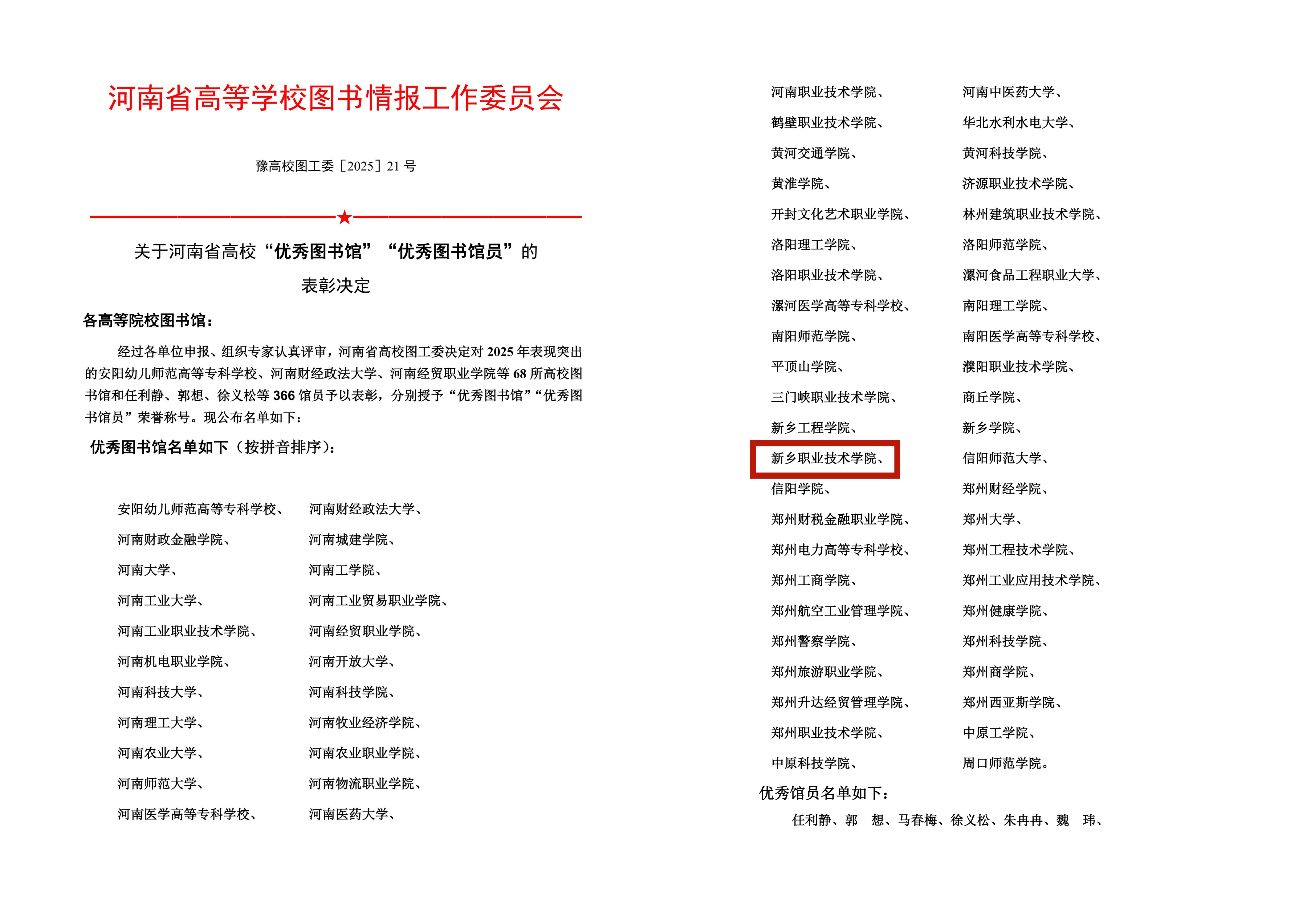 近日,河南省高等学校图书情报工作委员会高校图书馆评优结果公布,我校三度摘桂省高校优秀图书馆,刘艳青、胡鑫两名馆员荣获优秀图书馆员称号。