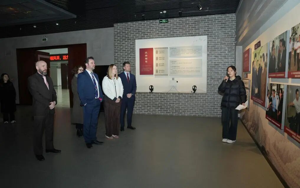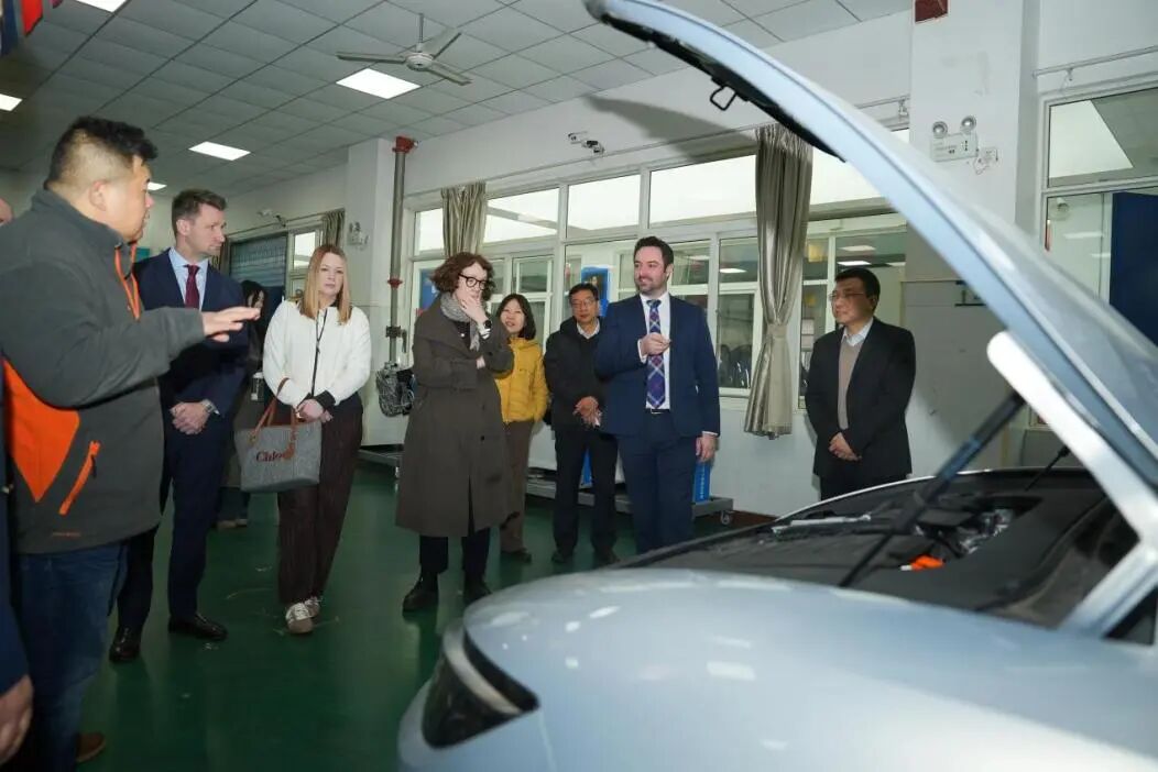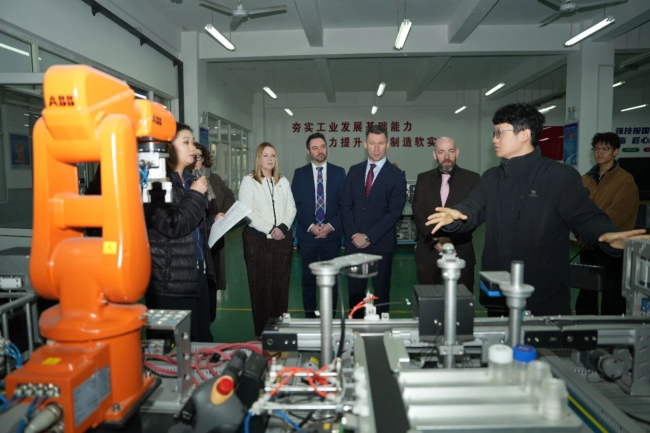 会议结束后,英国福斯谷学院一行参观了我校交通学院7号实训楼、智能制造学院6号实训楼以及校史馆。代表团成员对我校完善的实训教学设施、鲜明的职业教育特色、深厚的校园文化底蕴给予了高度评价和充分赞誉。