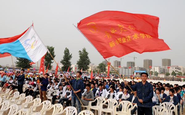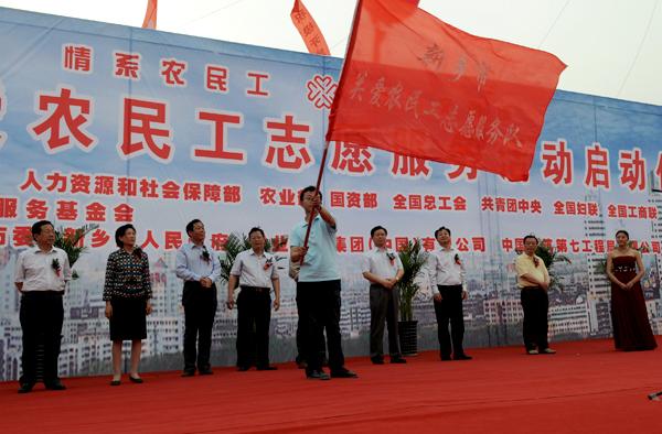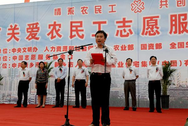 新乡职业技术学院餐旅与建筑工程教学部陈曦老师在仪式上挥动起从市长李庆贵手中接过的关爱农民工志愿者服务队队旗,号召全市的团员青年积极投身到关爱农民工的行列中来。