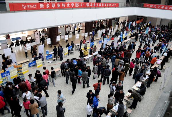 11月20日上午,新乡职业技术学院2012届毕业生秋季双选会在学院综合楼一楼大厅成功举行。全国105家用人单位携5000余个岗位而来,其中参会的金龙铜管集团、中航工业集团、中电22所、河南新飞集团、河南心连心、卫华集团、立白集团、郑州宇通客车、富士康科技集团、福耀集团、东风日产、三全食品、格力电器、美的集团、奇瑞汽车、海尔电器、中达电子等全国名优用人单位占参会单位40%以上,提供的优质就业岗位2000余个。
