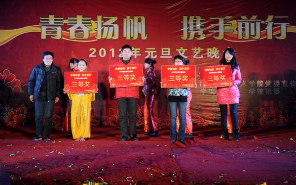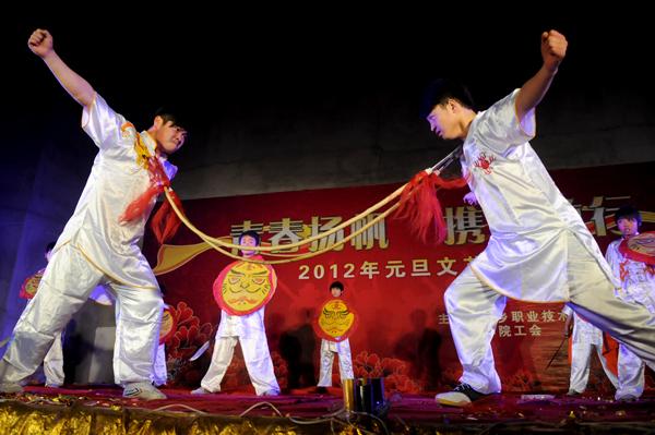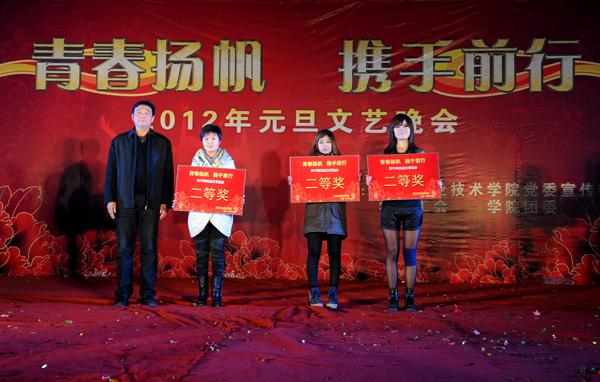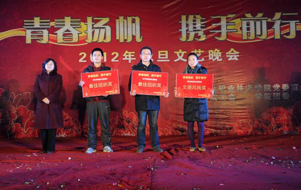 12月26日晚,由学院党委宣传部、院团委、工会共同主办的“青春扬帆 携手前行”2012年元旦文艺晚会隆重举行,院领导与全院师生欢聚一堂,载歌载舞,喜迎新年的到来。 在歌伴舞《欢乐中国年》中,一年一度的元旦文艺晚会拉开帷幕。