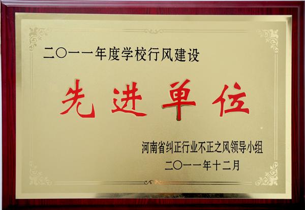 我院在2011年度民主评议行风工作中成效显著、办学招生收费规范、学生满意度高,被河南省纠正不正之风领导小组授予“2011年度学校行风建设先进单位”荣誉称号。