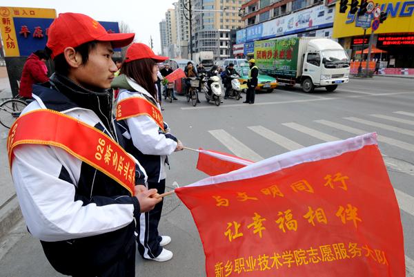 3月4日早上,我院60名 “爱我家园志愿者” 头戴小红帽在新乡职业技术学院志愿服务大队队旗引领下来到百货大楼岗和双桥岗。在经过交警培训后,同学们随即按照要求到岗协助维持交通秩序,劝导并纠正行人、非机动车不文明交通行为,帮助老、弱、病、残、孕等人员安全通行。