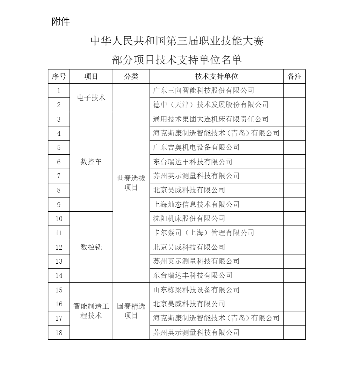 根据《中华人民共和国第三届职业技能大赛执行委员会办公室关于征集技术支持的公告》,经相关单位自主申报、资格审查、专家评审等程序,暂定广东三向智能科技股份有限公司12家单位为电子技术(世赛选拔)等4个项目的技术支持单位,现予以公示。