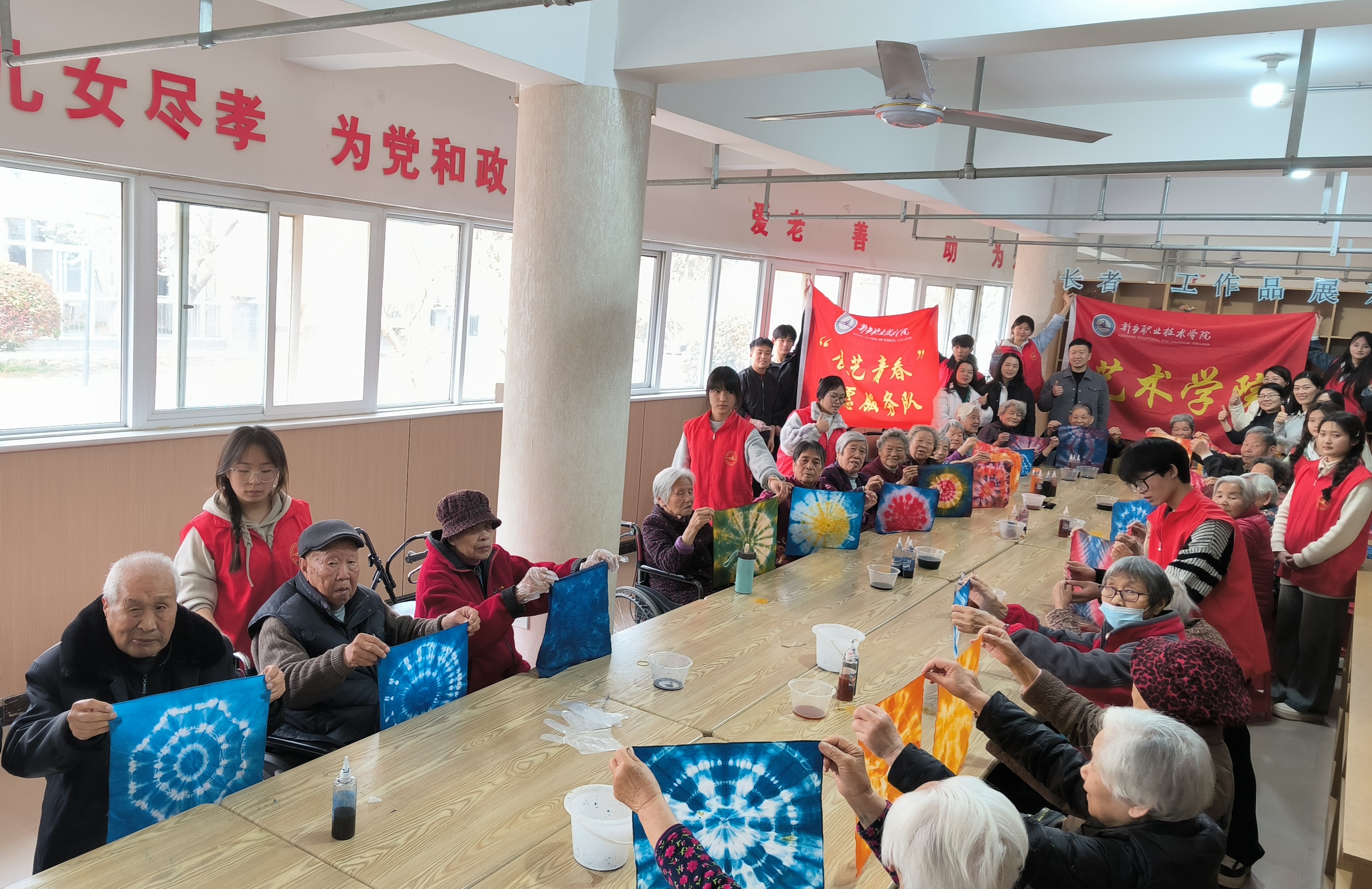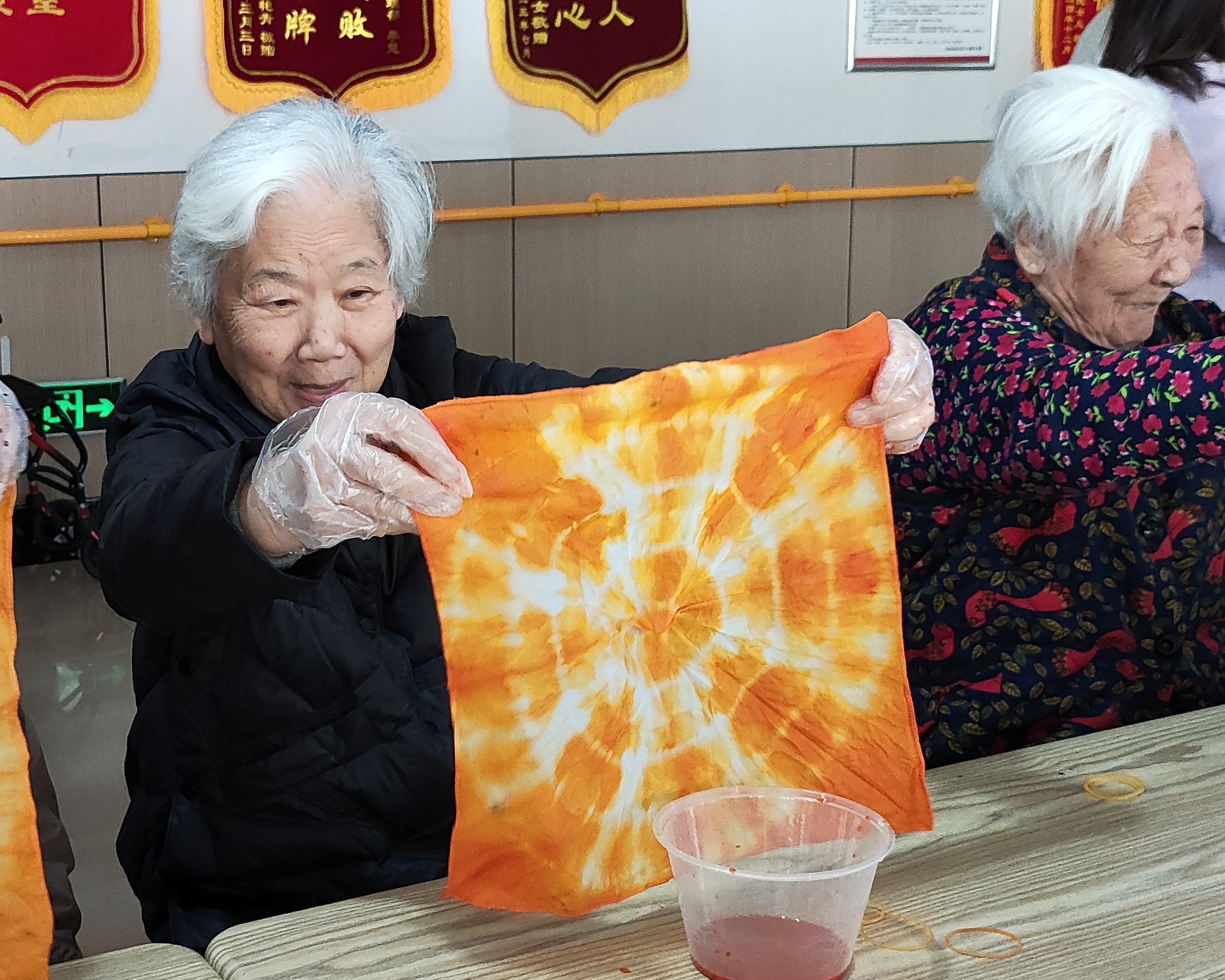 紧接着,视传专业的同学们带领爷爷奶奶体验了非遗扎染技艺。在志愿者的耐心指导下,老人们亲手制作完成,并为自己独一无二的作品感到惊喜无比,活动现场欢声笑语不断。