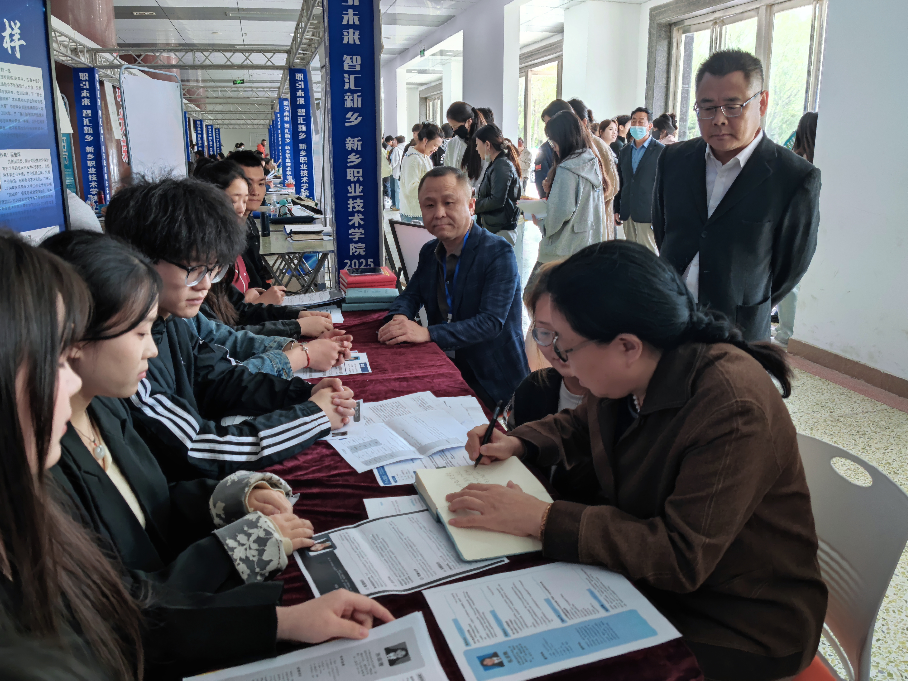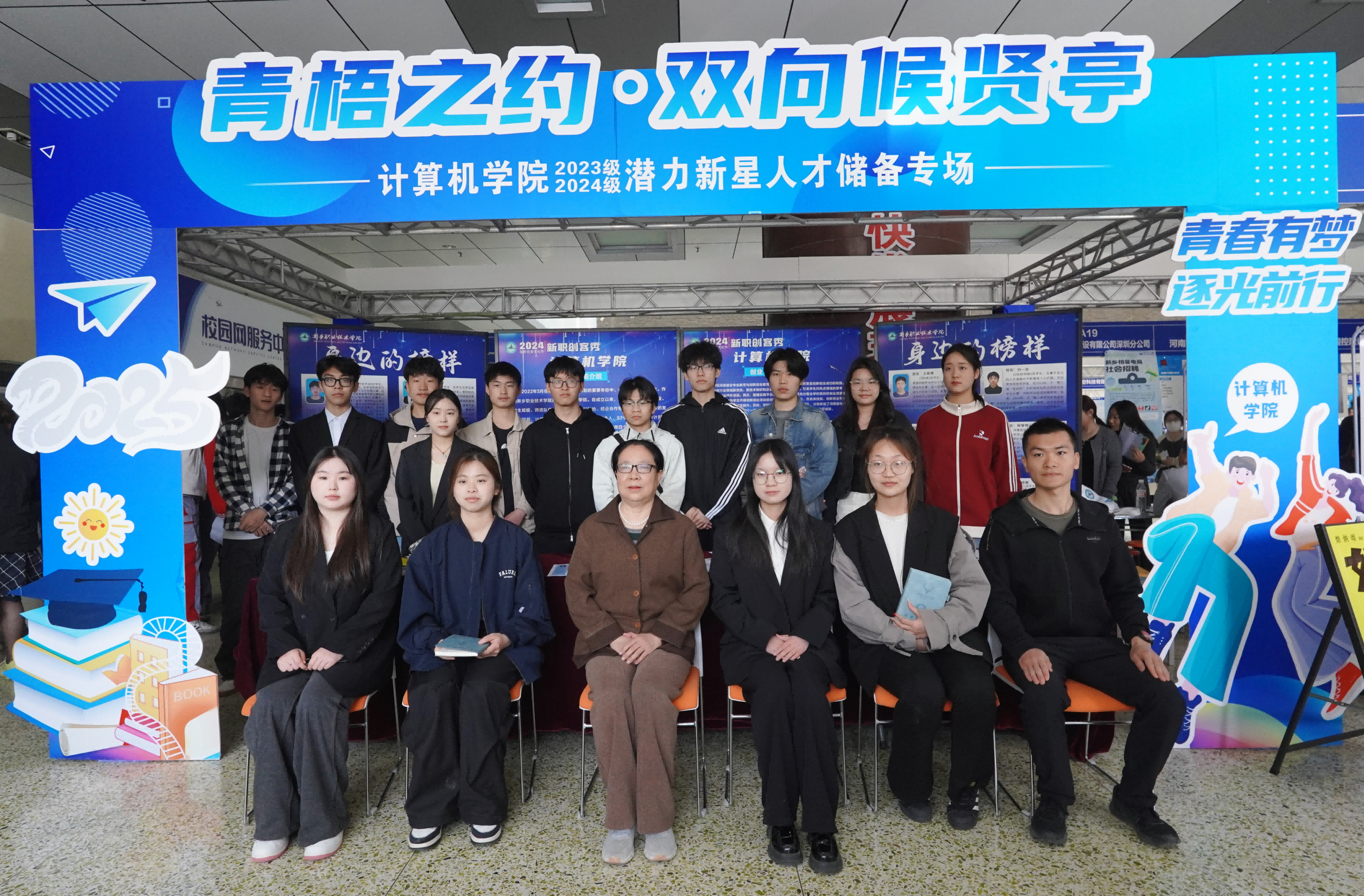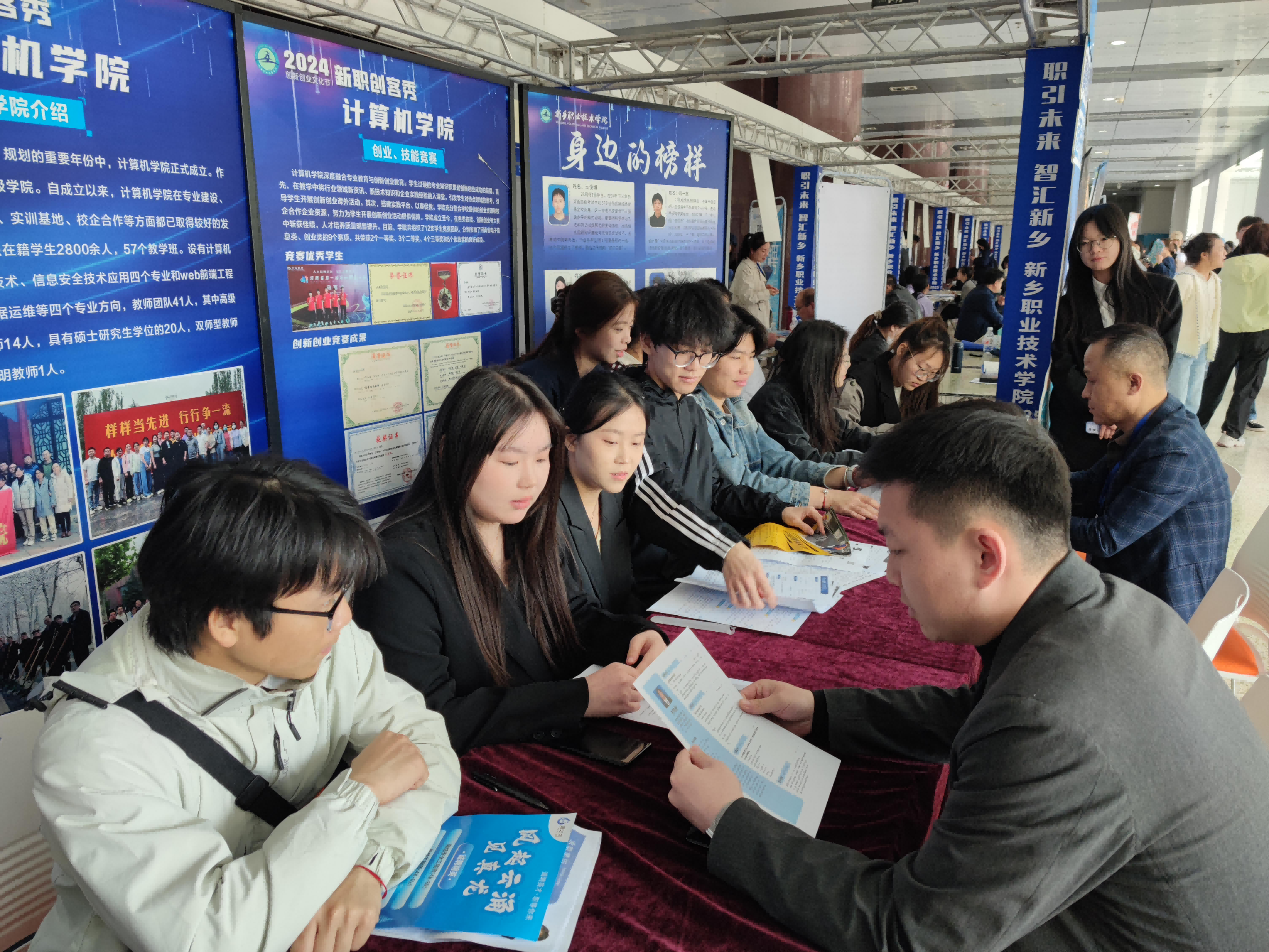 为深化校企协同育人机制,构建人才储备新生态,4月12日,在学校2025年春季校园招聘会期间,计算机学院在综合楼一楼成功举办了“青梧之约·双向候贤亭”2023、2024级潜力新星人才储备专场活动。学院院长邢作辉、党总支副书记牛瑞斌、2025、2026届辅导员(班主任)以及600余名学生齐聚一堂,共同见证并推动校企协同育人机制落地生根。