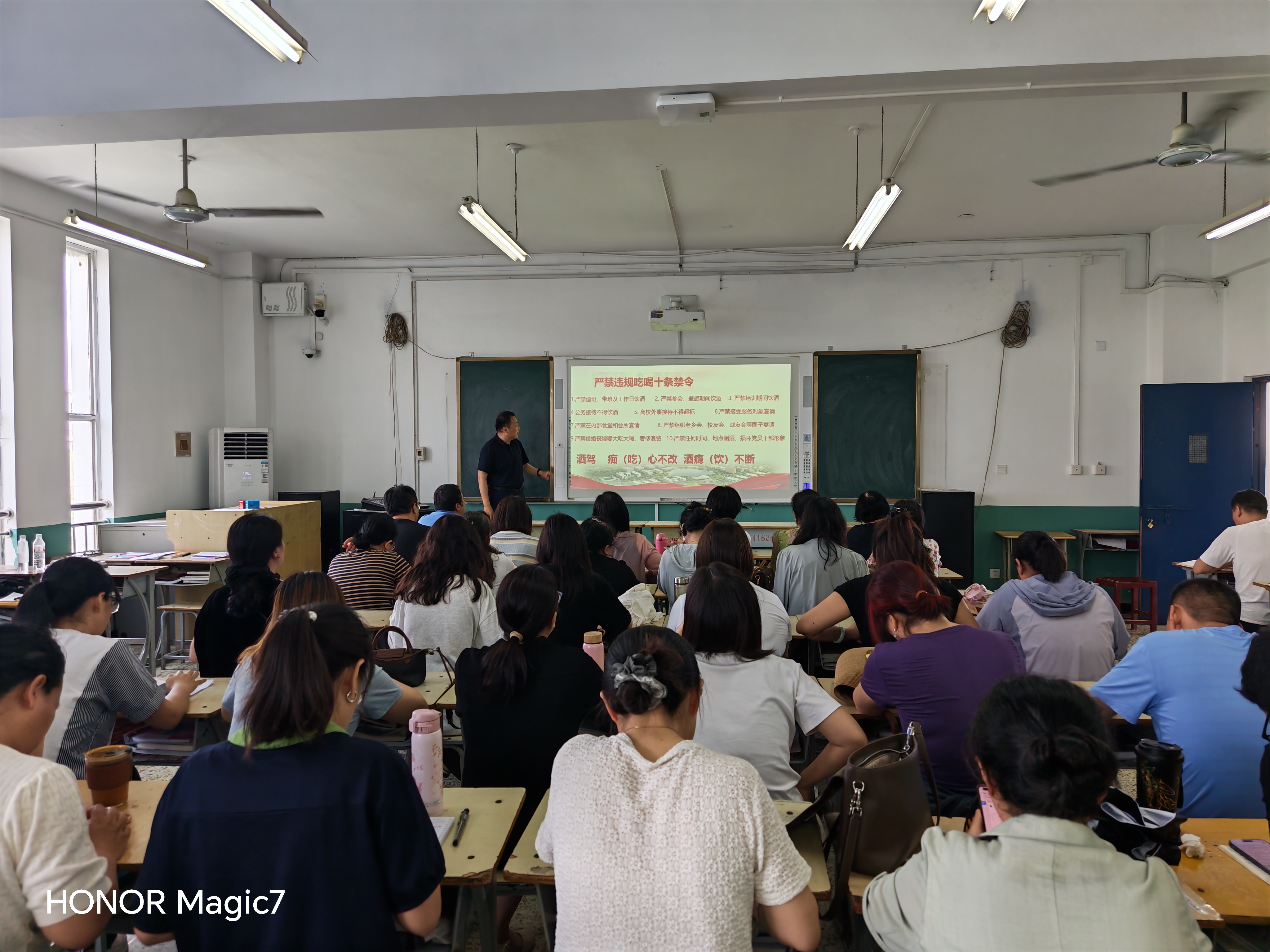 随后,李德武结合学院实际,逐条解读了“严禁违规吃喝十条禁令”,包括严禁值班带班及工作日饮酒、严禁参会差旅期间饮酒、严禁培训期间饮酒、严禁接受服务对象宴请等具体内容。他指出,违规吃喝看似小事,实则是滋生腐败的温床,全体教职工必须时刻绷紧纪律之弦,做到知敬畏、存戒惧、守底线。
