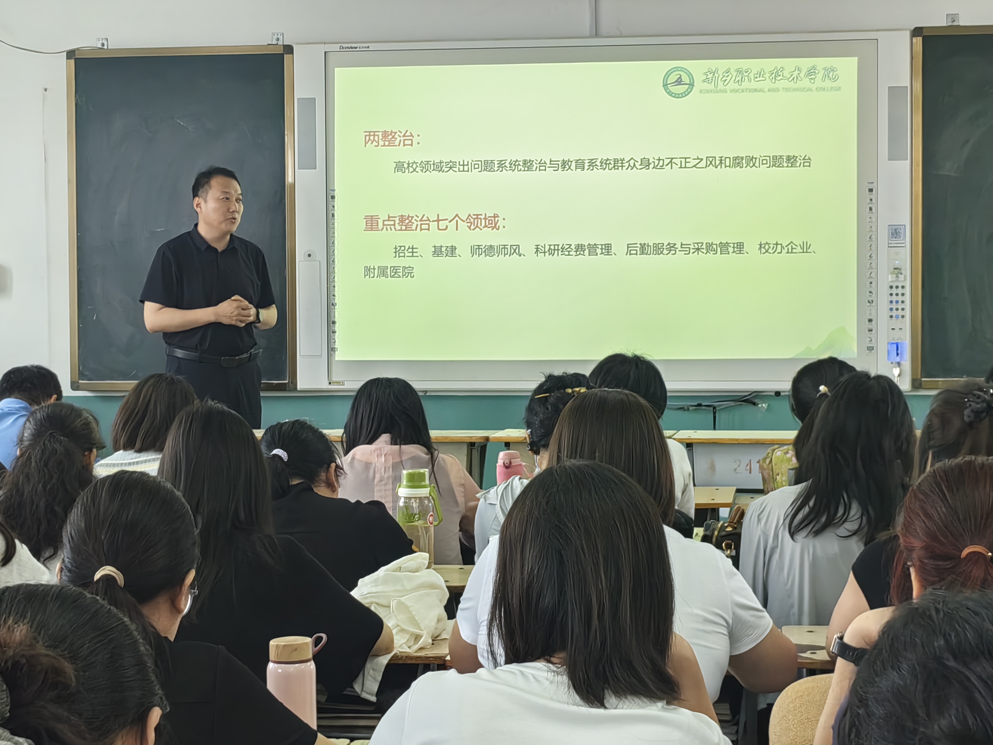 李德武结合高校工作实际,围绕“高校领域突出问题系统整治”和“群众身边不正之风整治”两大重点展开深入剖析。他重点分析了招生、师德师风、科研经费等七个关键领域的廉政风险,并通过典型案例进行警示教育。李德武强调,高校作为人才培养的重要阵地,必须严守纪律红线。师德师风是教师的立身之本,教师的一言一行都关系着教育的公信力。