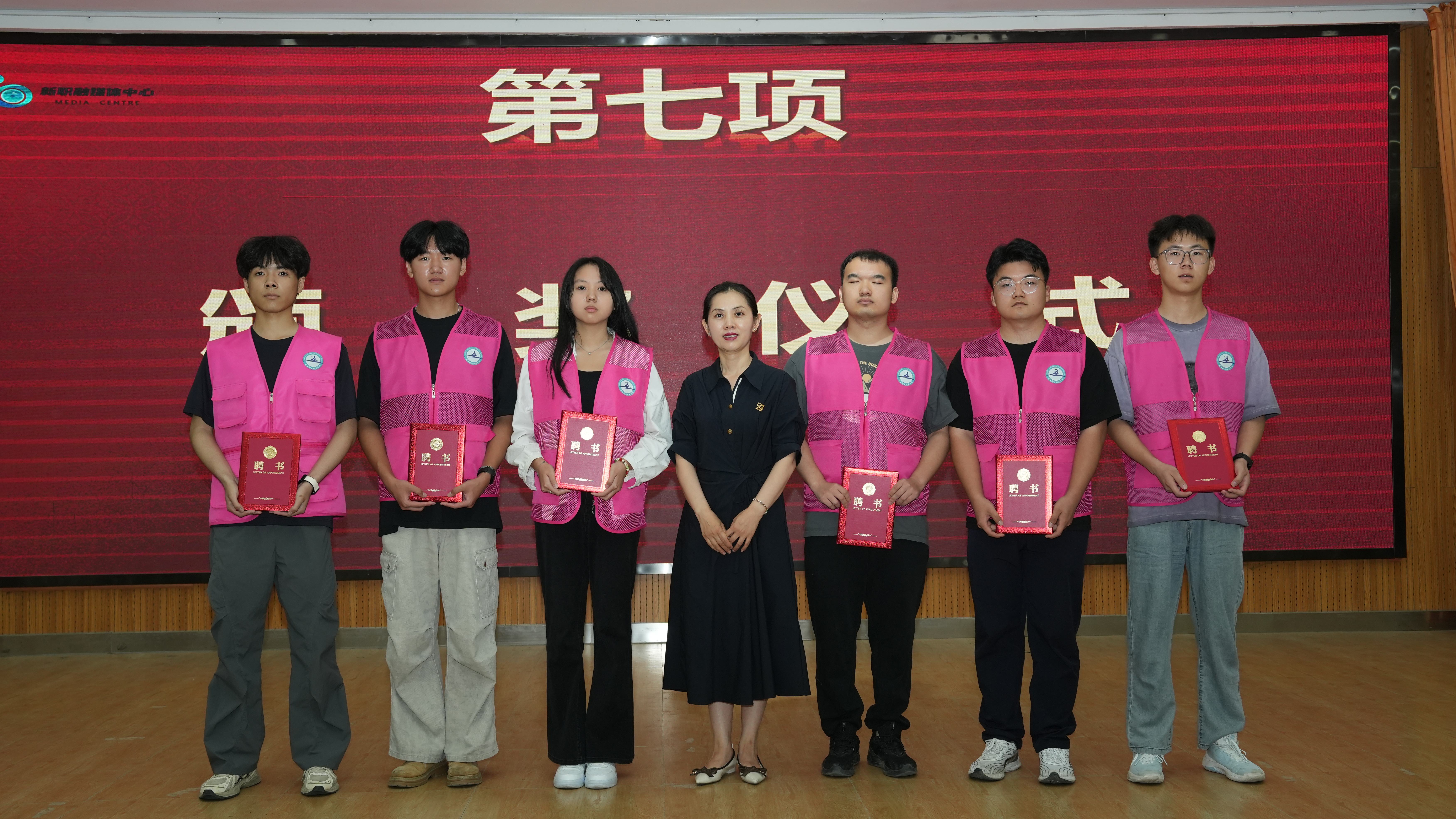 原淑慧为受聘的2025级融媒体中心记者团学生干部代表颁发了象征责任与担当的聘书。