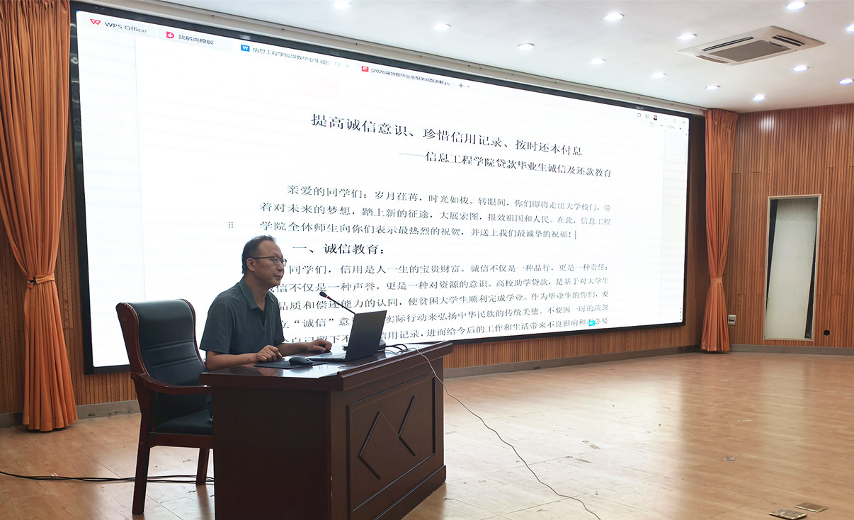 为进一步强化国家助学贷款贷后精细化管理,提升金融风险防控实效,切实增强毕业生群体的诚信履约意识与社会责任担当。6月16日,信息工程学院在实验楼一楼阶梯教室组织开展贷款毕业生诚信教育专题活动,活动由学生科科长王鹏担任主讲。