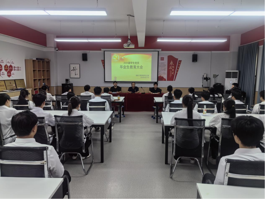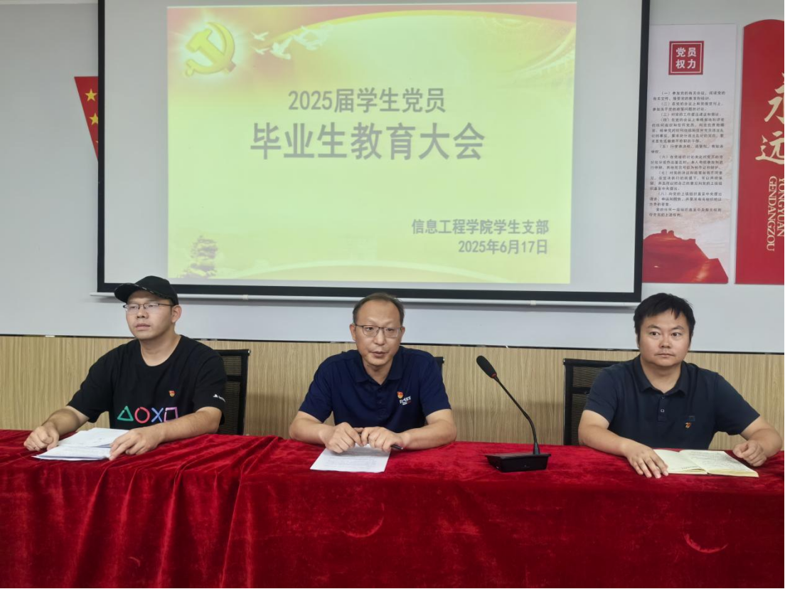 为进一步强化毕业生党员的责任意识与使命担当,引导毕业生党员坚定理想信念。6月17日,信息工程学院学生党支部于实验楼218会议室召开2025届毕业生党员教育大会。会议由学生党支部书记王鹏同志主持,组织委员张震、宣传委员赵严以及全体毕业生党员参会。