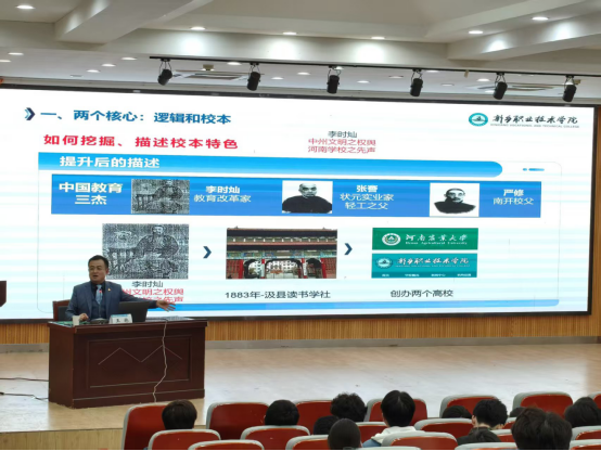 王林强调,“立足校本、深挖特色”是打造金奖作品的关键。他以我校百年办学历史中涌现的杰出校友为例,鼓励师生从学校深厚的文化底蕴和资源优势中汲取灵感,将专业特色与职业目标有机结合,构建具有校本特色和个人辨识度的职业路径。此外,他还围绕成长赛道与就业赛道的不同逻辑,详细讲解了如何通过“真实性、逻辑性、可行性、感染力”四大要素提升答辩表现,并现场分享了多个国赛金奖案例的策划思路与呈现技巧。