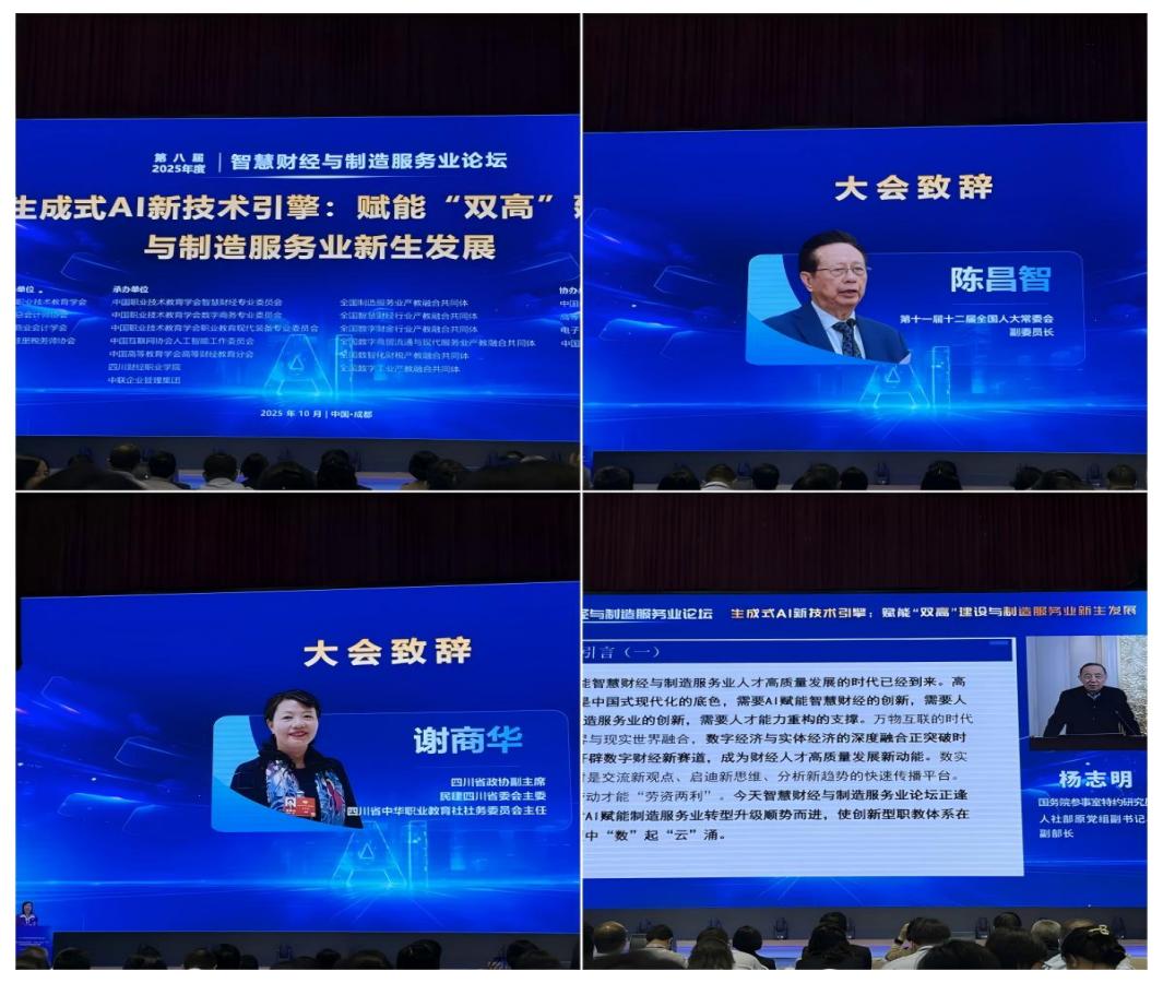 10月17日,第八届智慧财经与制造服务业论坛在四川财经职业学院成功举办。本届论坛以"生成式AI新技术引擎:赋能'双高'建设与制造服务业新生发展"为主题,第十一届、十二届全国人大常委会副委员长陈昌智,四川省政协副主席谢商华,国务院参事室特约研究员、人力资源和社会保障部原党组副书记、副部长杨志明等领导出席并发表重要讲话。