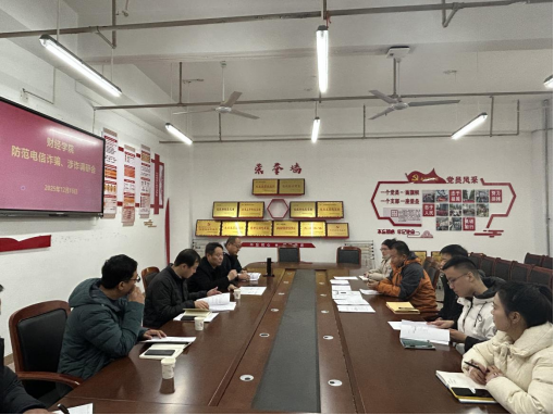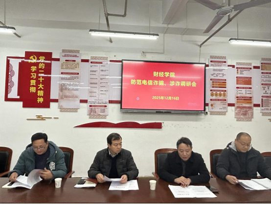 为进一步压实校园电信诈骗防范工作责任,精准排查涉诈风险隐患,切实保障学生财产安全与校园稳定。12月16日,学校保卫处、纪委、学生处相关领导组成联合调研组,莅临财经学院开展电信诈骗防范专项调研工作。财经学院副书记、辅导员代表参加调研座谈会。