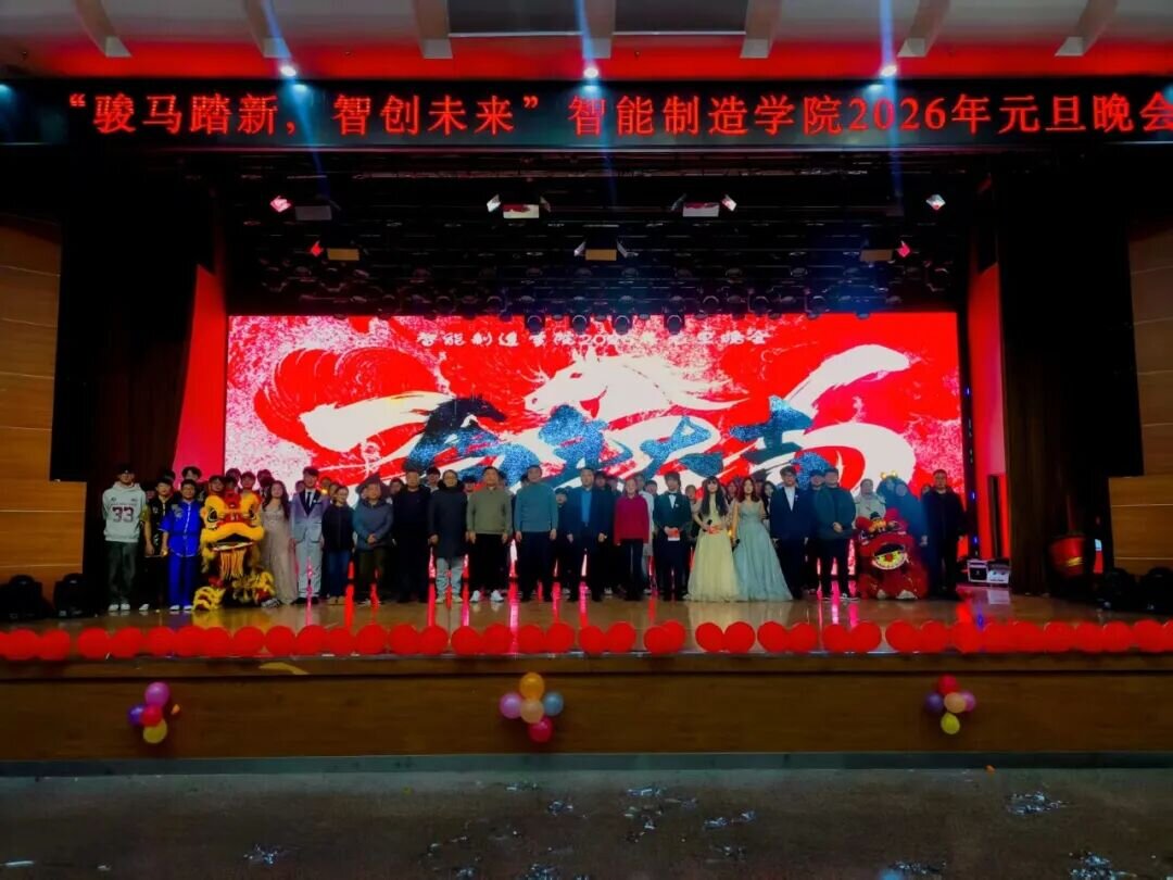 2025年12月28日晚,综合楼二楼报告厅灯火璀璨、暖意激扬,智能制造学院“骏马踏新,智创未来”2026年元旦晚会在此隆重上演!智能制造学院党总支书记李德武、副院长申向丽、党总支副书记李雪岩等院领导与七百余名师生欢聚一堂,共迎新年。