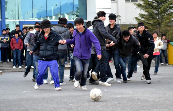 昨天下午,在三号教学楼前进行了第一轮淘汰赛。比赛要求每班出14名队员,两人一组,两名队员固定一只手,一人蒙眼,一人负责指挥。要求踢球必须由蒙眼队员触球,不蒙眼的只许负责指挥。每场比赛时间为二十分钟。面对这种形式新颖、充满趣味性的比赛,同学们个个热情高涨、信心满满。比赛中队员们配合默契,场外观众加油助威,整个活动在热烈、欢快的气氛中进行。