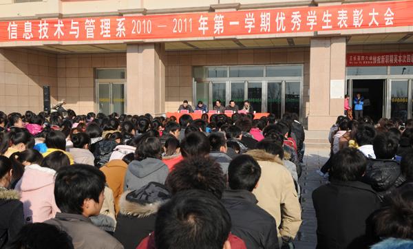 3月10日下午,信息技术与管理系全体学生召开了隆重的表彰大会。表彰会上对上学期的先进班级,三好学生,优秀班干部,优秀学生会干部进行了表彰。四位各专业的优秀学生代表分别向与会学生介绍了各自的学习方法,畅谈了人生理想。系领导郝同武、赵志强、原伟从自信心的树立,学习习惯的培养,以及对新学期工作的决心,向全体师生提出了新的要求。