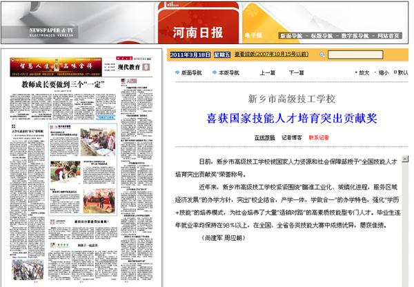 新乡市高级技工学校喜获国家技能人才培育突出贡献奖 ——原载于《河南日报》3月18日现代教育