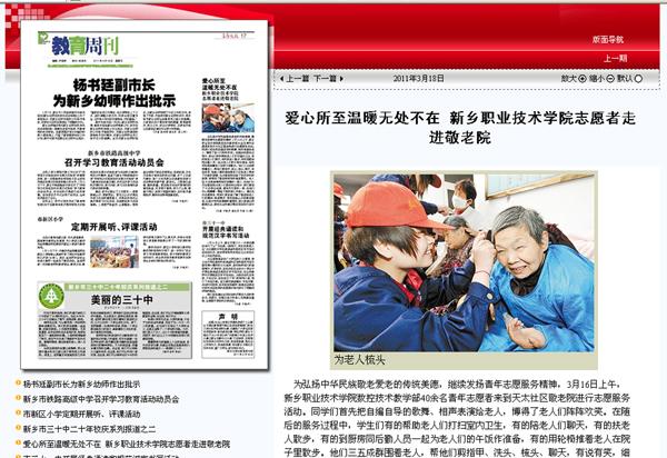 爱心所至 温暖无处不在 ——新乡职业技术学院志愿者走进敬老院 原载于3月18日《平原晚报》