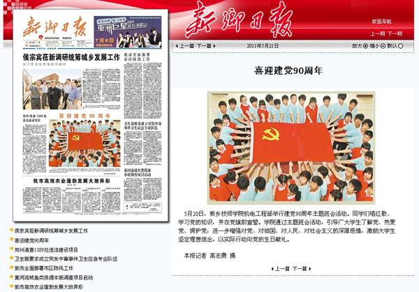 喜迎建党90周年 原载于2011年5月21日《新乡日报》第一版