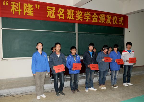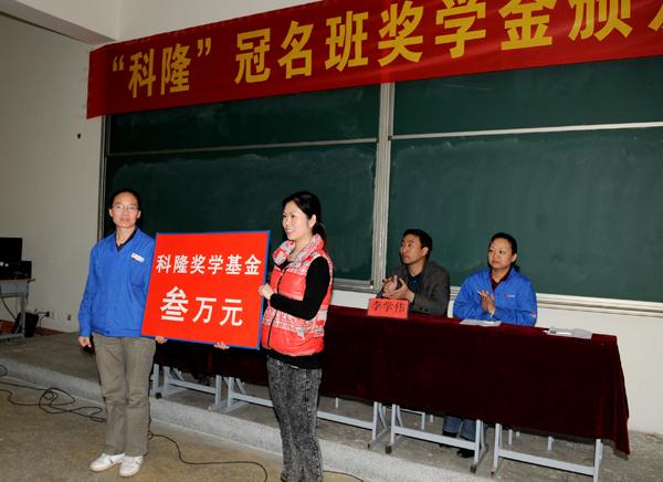 与会领导为获得奖学金的36名学生颁发了荣誉证书及奖金,科隆订单班获奖学生张鹏在激动与喜悦的同时代表学生发言,表达了将在学校的关心和科隆集团的资助下继续努力学习、实现自我、超越自我的决心。