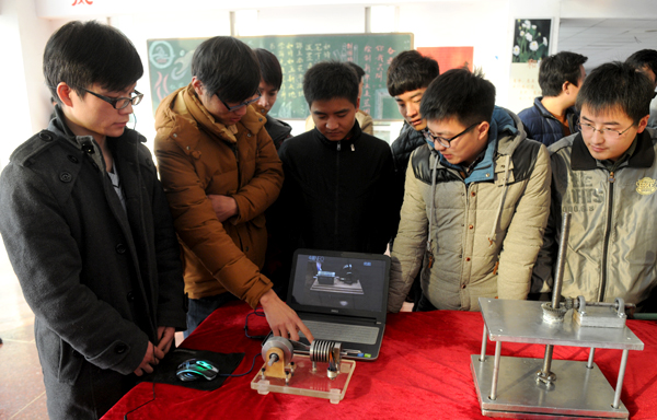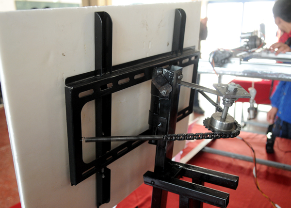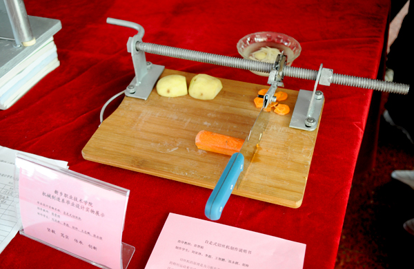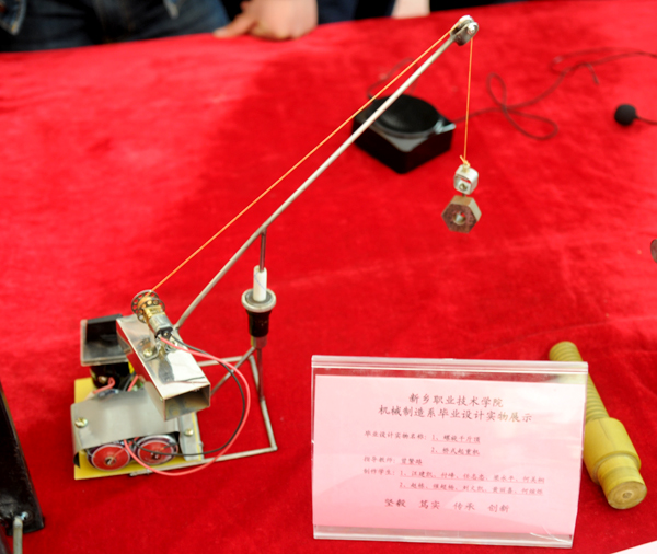 展览现场我们看到,桥式起重机模型在电动机的牵引下轻松地将物体提起,自走式切丝机利用自动进给原理将胡萝卜切成均匀的细丝,马达驱动绞车把物体顺利地送到操作者眼前,可调电视挂架让观看电视的人有了更多的观看角度,直齿轮减速器、斜齿轮减速器、蜗轮蜗杆减速器,突破了多年来机械类毕业设计只设计图纸不做实物的惯例,一只单缸活塞发动机在酒精燃烧达到一定温度后开始了往复运动……,这些作品虽然比较粗糙,有的还存在一定缺陷,但都是利用了机械专业课程中多个简单机构的巧妙组合,配以同学们自己亲手设计制作的零件组装在一起,充分凸显了职业类院校学做合一、工学一体的办学特点。
