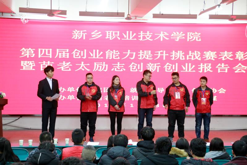 11月30日,冬日的寒风抵挡不住同学们创业的热情,新乡职业技术学院第四届创业能力提升挑战赛表彰暨苗老太励志创新创业报告会在实验楼一楼阶梯教室隆重举行。学院领导许毅明副院长、教务处、学生处、实训处、宣传部、心理健康中心和就业指导中心负责人莅临现场参加了颁奖仪式;所有参加决赛的创业团队和各院系学生代表参加了大会。